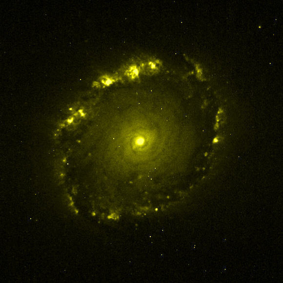 This image was taken by the Wide Field and Planetary Camera 2 (WFPC2). The yellow colour (659 nm) represents visible light from (redshifted) ionised hydrogen (H-alpha). The image was taken on 5 March, 1999, and has an exposure time of 5200 s.