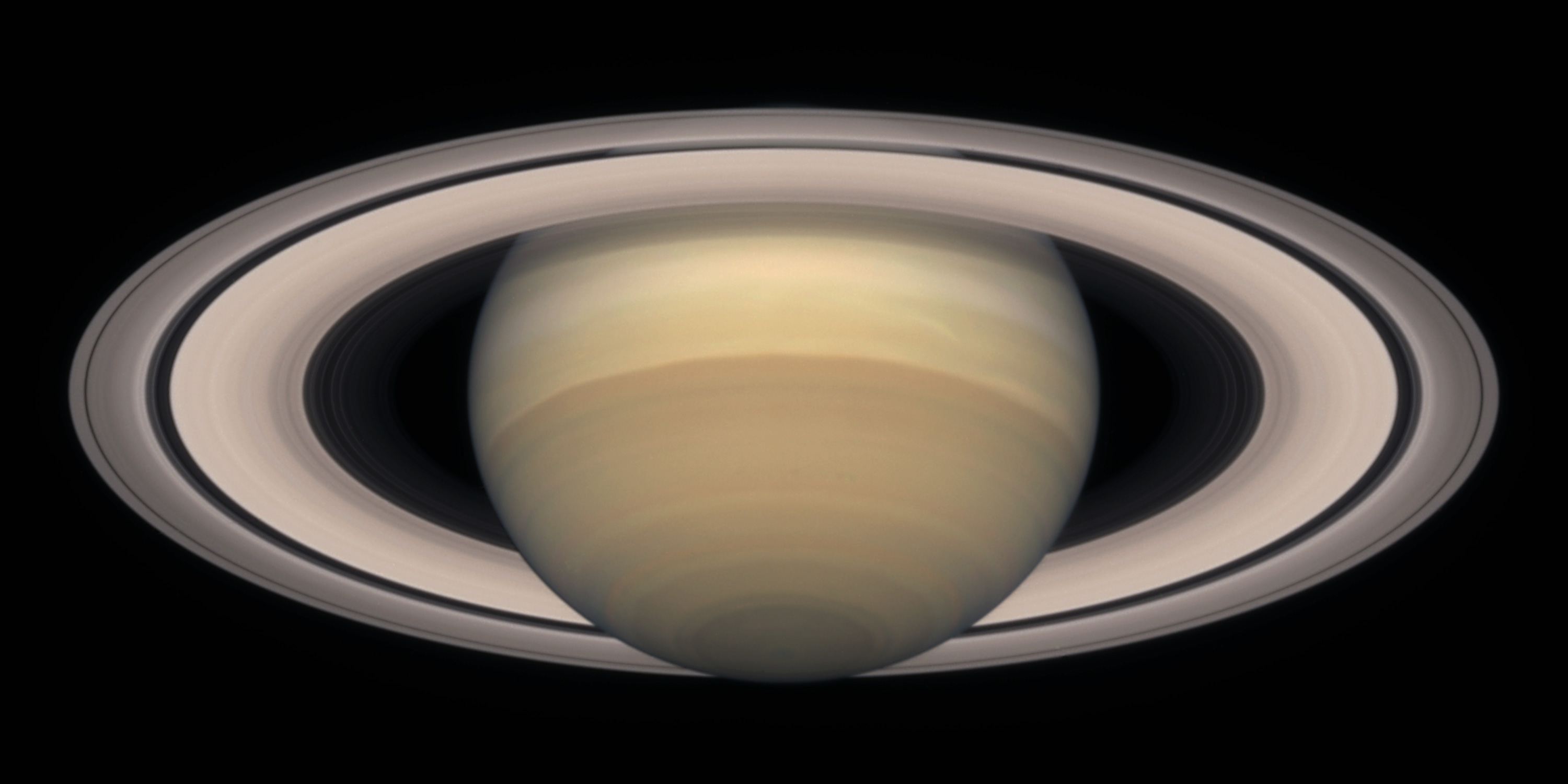 The delicate color variations in the clouds are due to smog in the upper atmosphere, produced when ultraviolet radiation from the Sun shines on methane gas. Deeper in the atmosphere, the visible clouds and gases merge gradually into hotter and denser gases, with no solid surface for visiting spacecraft to land on.
