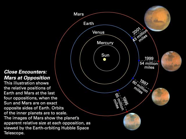 This illustration shows the relative positions of Earth and Mars at the last four oppositions, when the Sun and Mars are on exact opposite sides of Earth. Orbits of the inner planets are to scale. The images of Mars show the planet's apparant relative size at each opposition, as viewed by the Earth-orbiting Hubble Space Telescope.