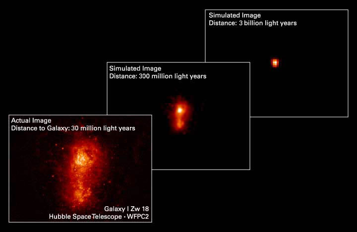 The pictures illustrate that less of the galaxy is seen at successively greater distances from Earth because the fainter stars are no longer visible.