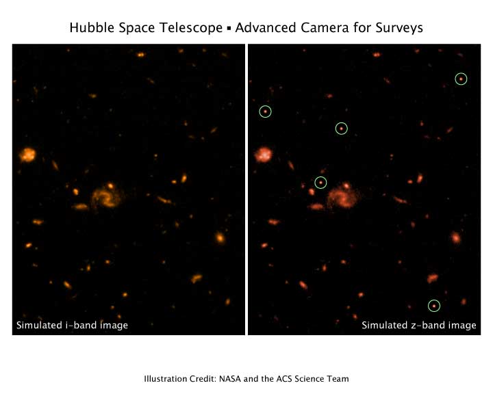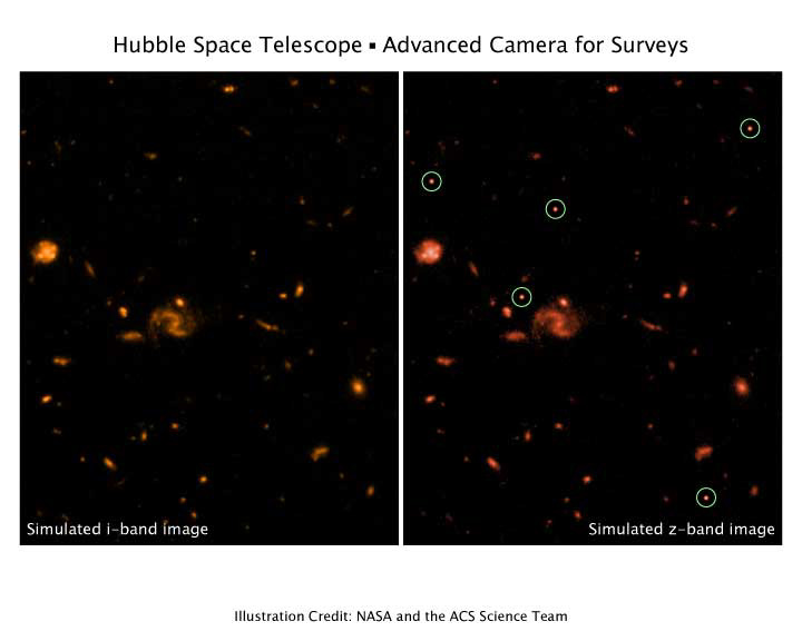 Unlike more local galaxies, which are visible in the bluer filters as well, the very large "redshifts" of galaxies at the edge of the observable universe mean that no light is emitted at the blue end of the spectrum. The vastly improved red sensitivity of ACS will enable astronomers to pick out and study such primordial galaxies from among the myriad of other, more commonplace, galaxies.