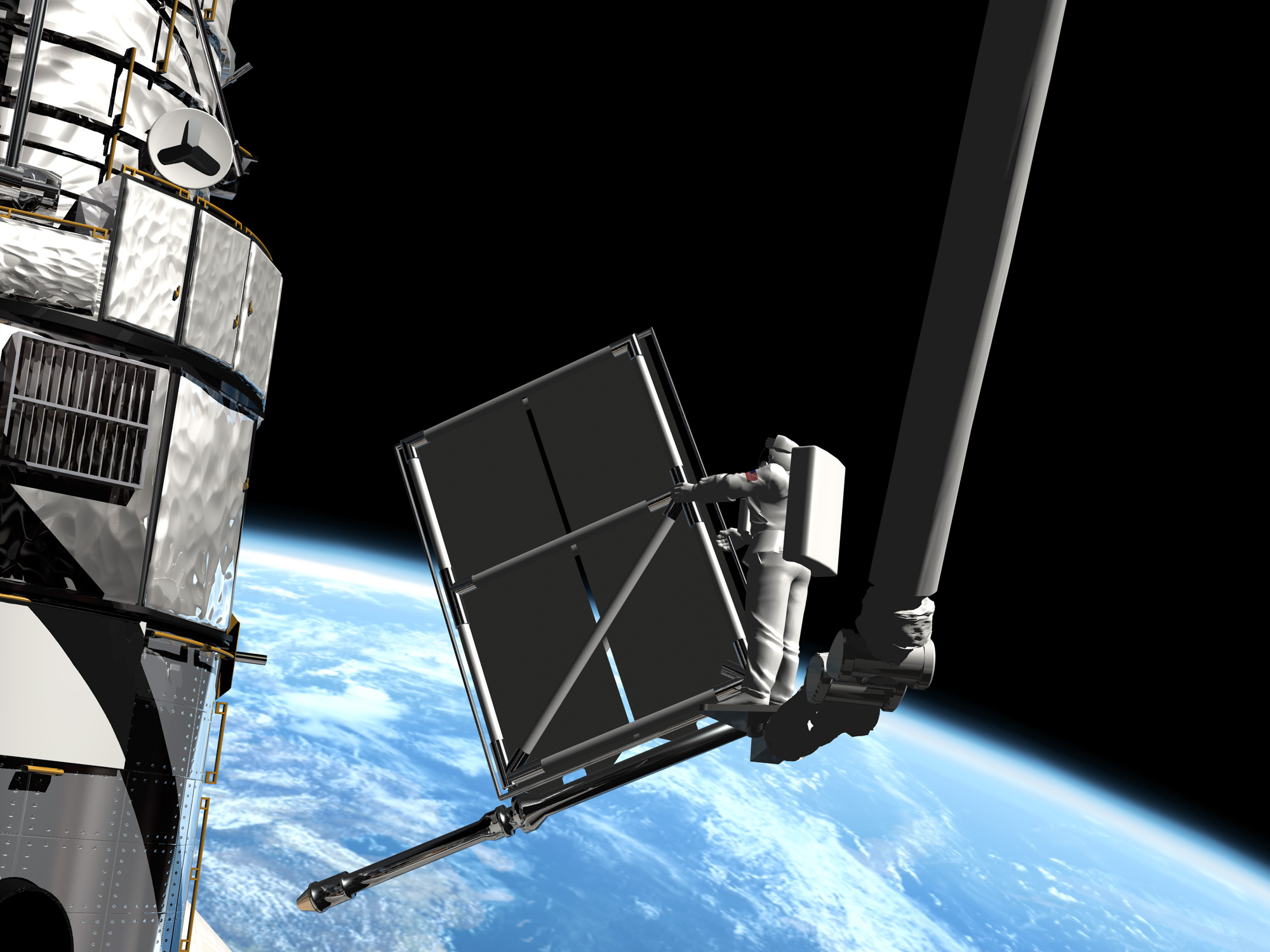 This artist's impression shows Hubble's new solar panels being inserted during Servicing Mission 3B in 2002.