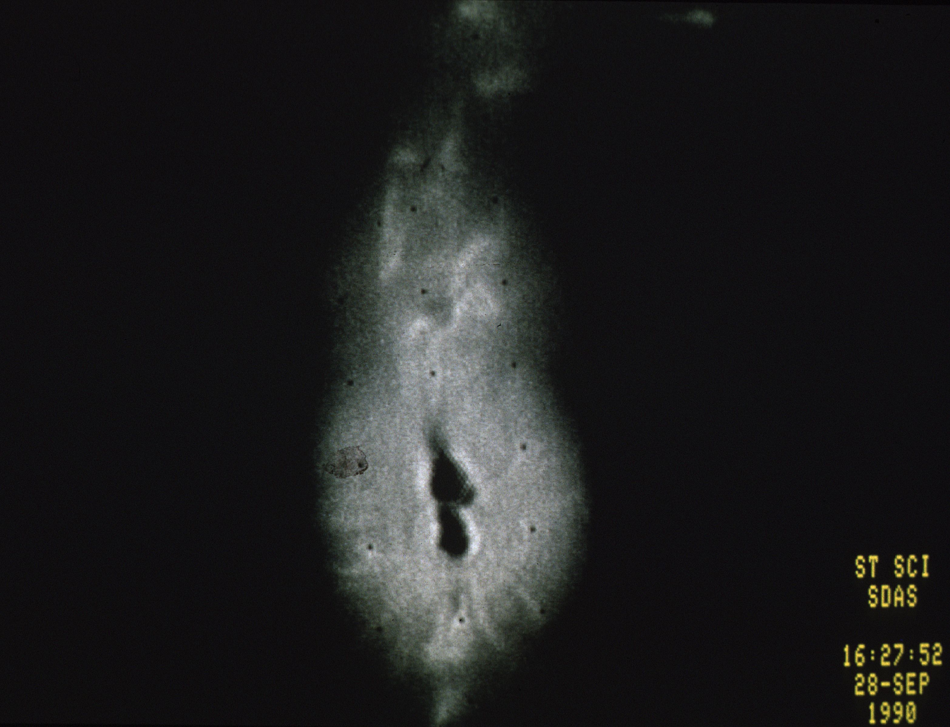 This is the first picture taken by HST of a recent nova, the star system R-Aquarii. The two dark knots at the center of the image probably contain the binary star system itself, which consists of a red giant and white dwarf star. The knots are dark due to saturation effects produced by the FOC detector when it observes very bright objects.