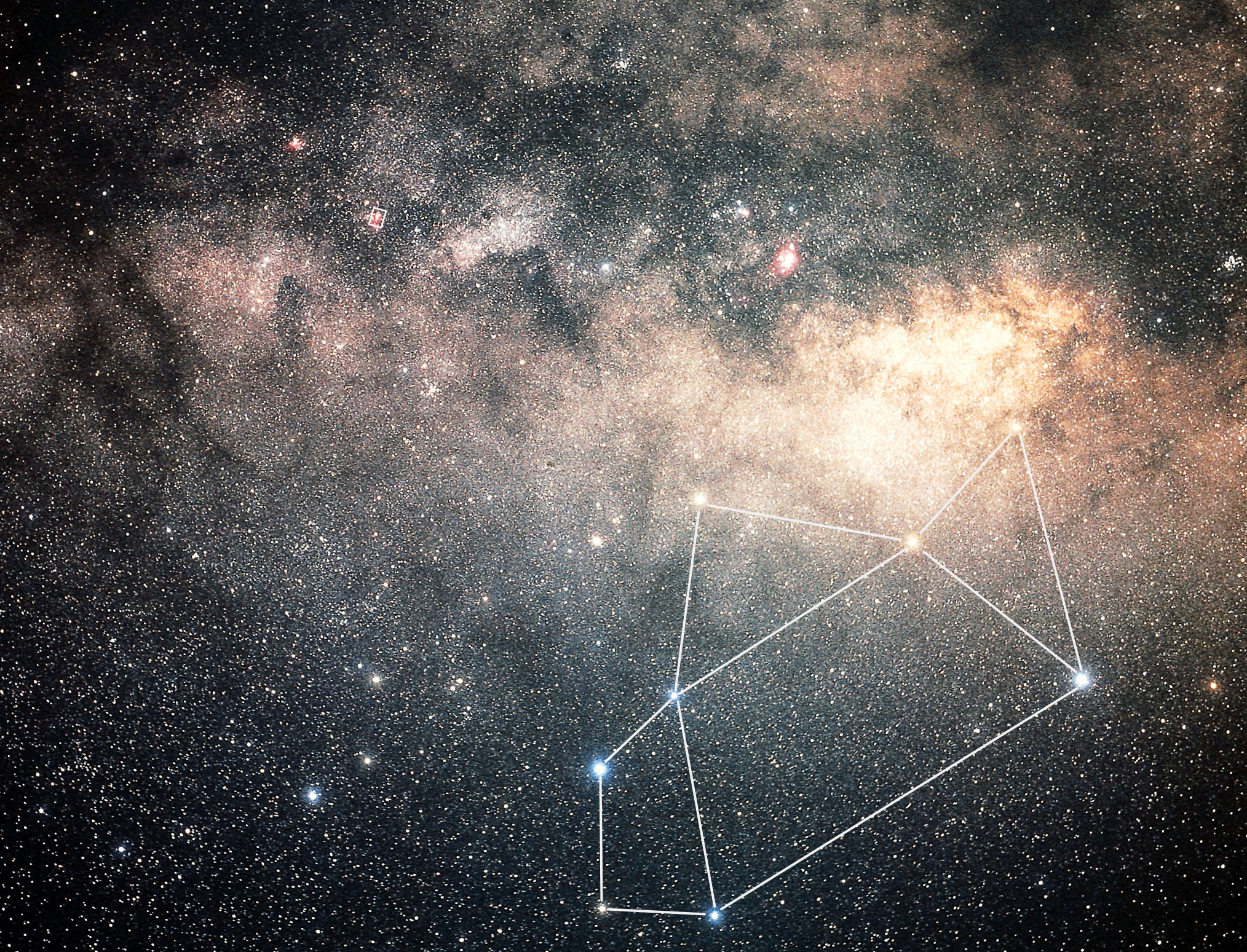 This photo was taken by the Japanese astrophotographer Akira Fujii and shows a full view of the constellation of Sagittarius, also known as the 'Teapot'. In the bottom right corner, the Omega or Swan Nebula (also known as Messier 17) is marked. The box corresponds to the NOAO image of this nebula.
