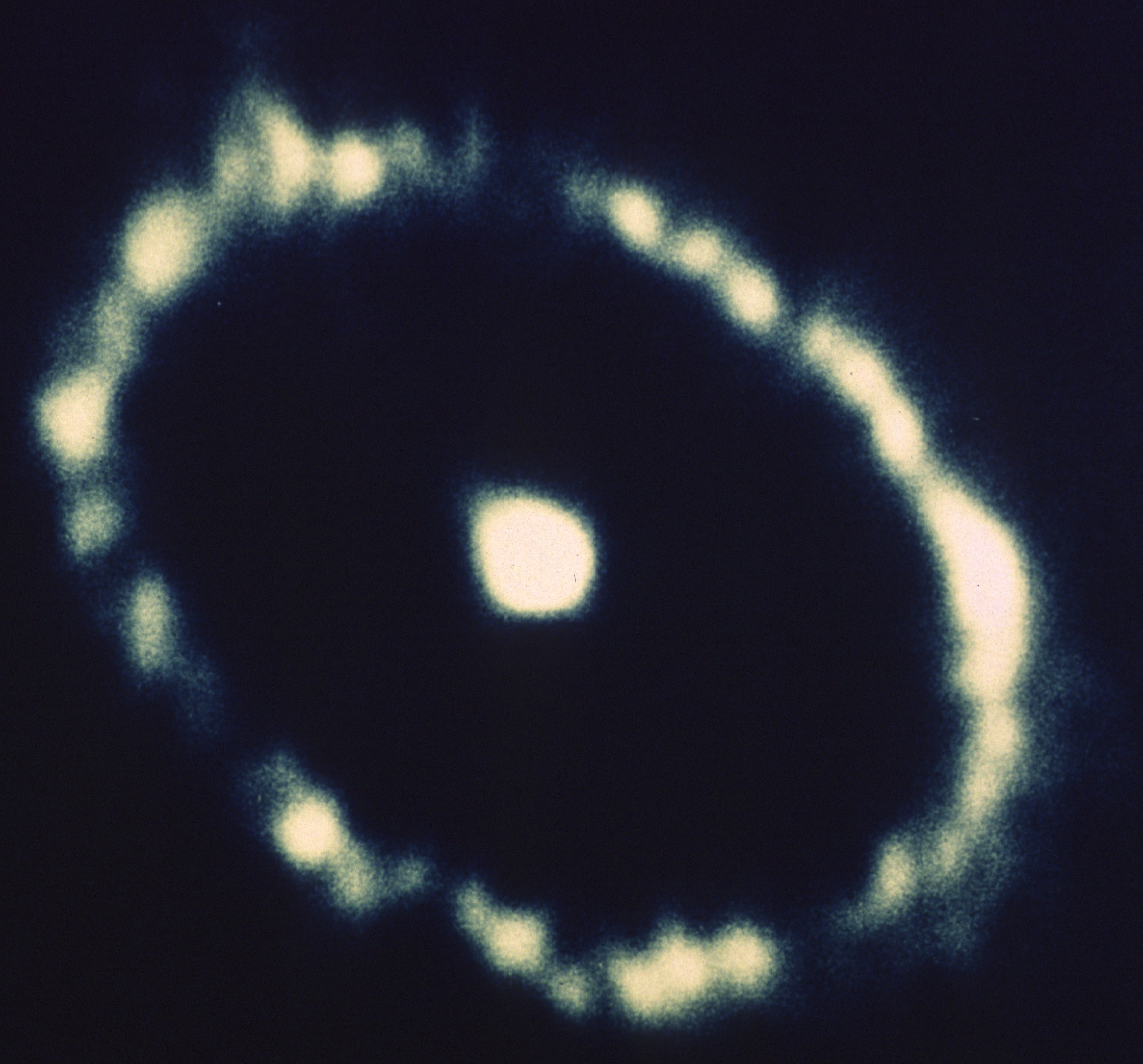 A NASA Hubble Space Telescope image of a gaseous ring surrounding the supernova 1987A, which exploded on 23 February 1987 in the Large Magellanic Cloud, an irregular satellite galaxy of the Milky Way.