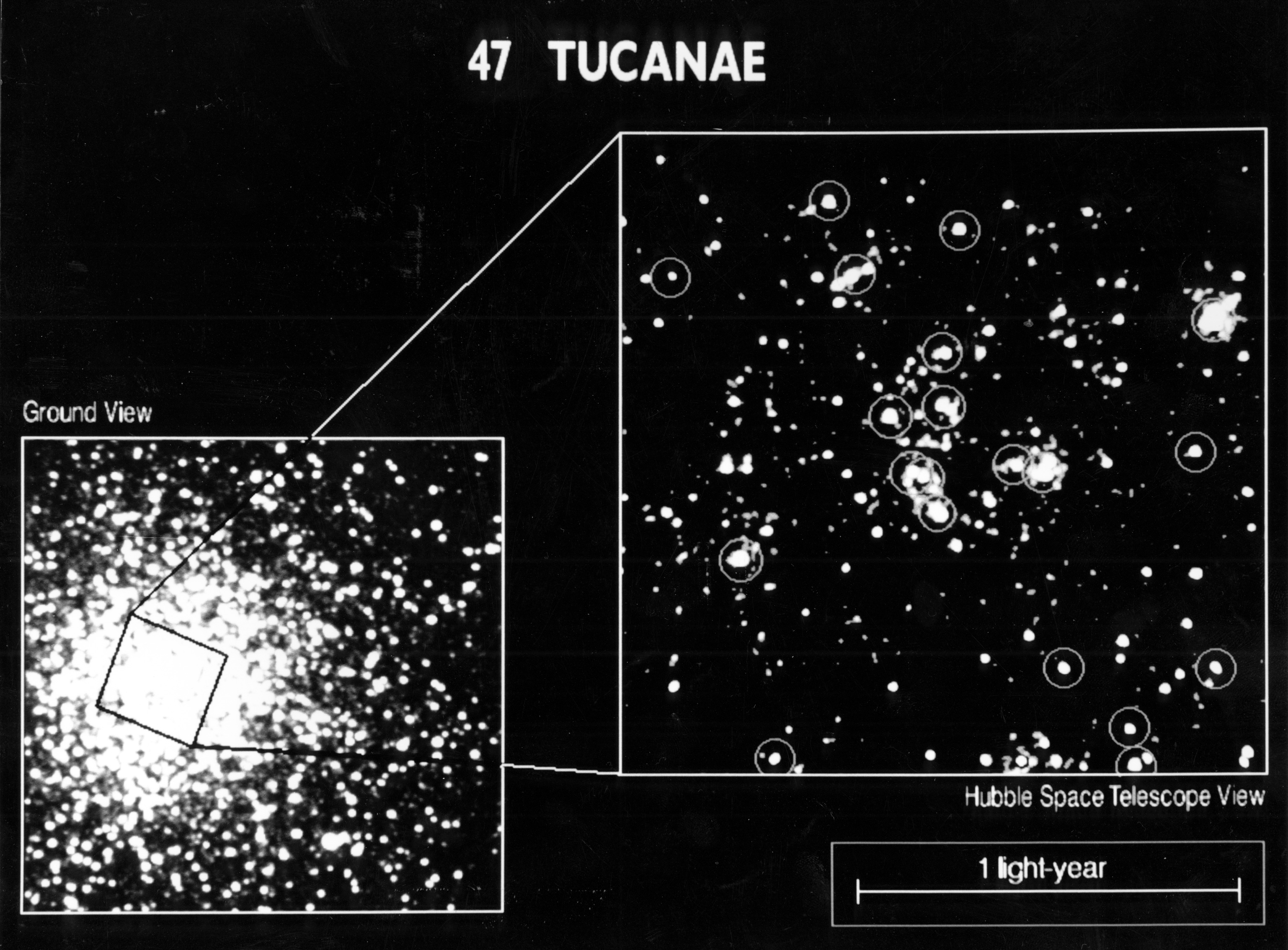[RIGHT] The core of the globular cluster 47 Tucanae, as imaged by the European Space Agency's Faint Object Camera (FOC) onboard NASA's Hubble Space Telescope. The FOC resolves several hundred stars where ground- based images only yield a few dozen stars. The image reveals so-called blue straggler stars (encircled) which are exceptionally bright in ultraviolet light. HST's UV sensitivity and high resolution allow it to easily separate the blue stragglers from the red giant stars which dominate the cluster.