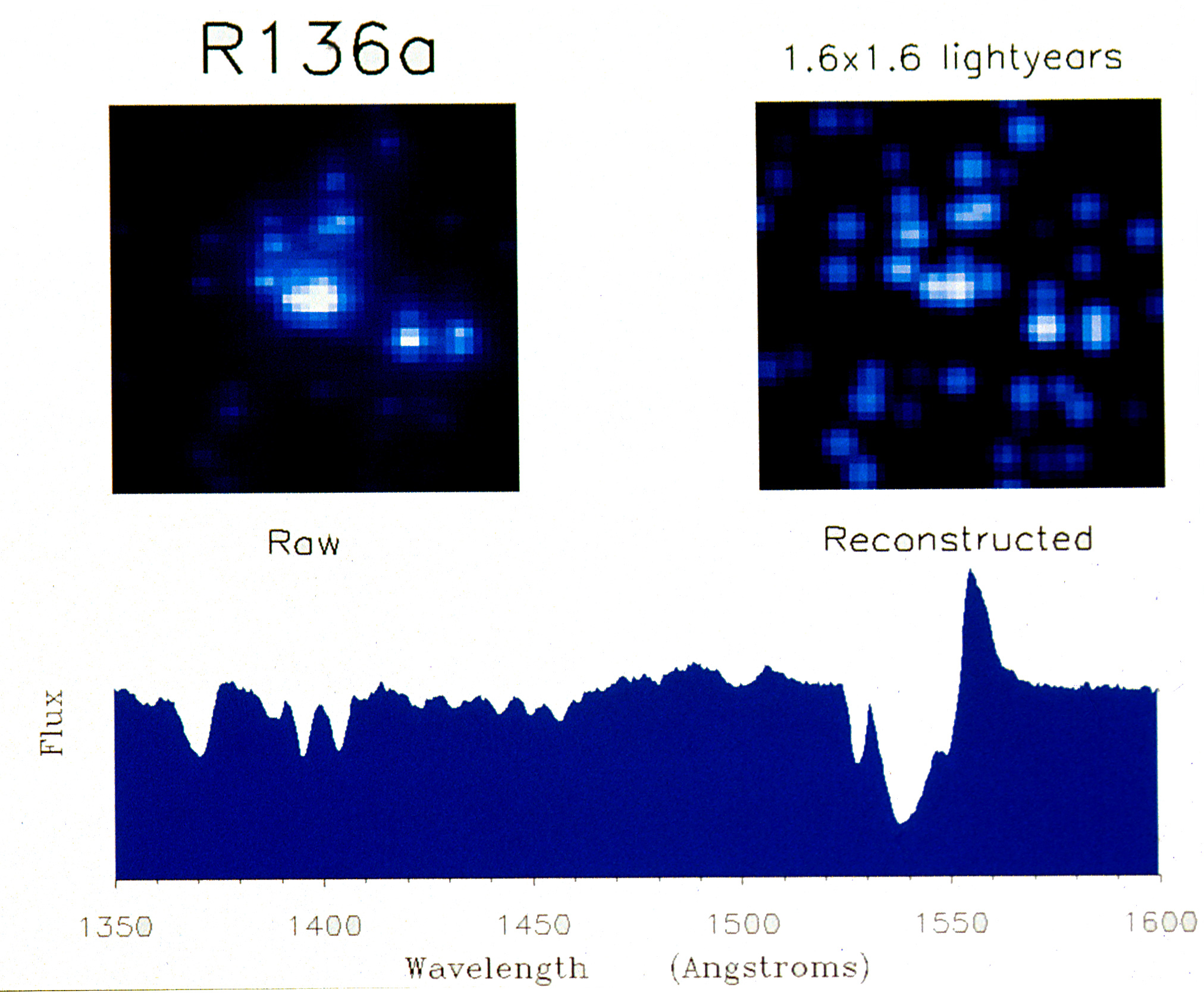 A new image processing technique has yielded the clearest view yet of an extraordinary star cluster located about 169 000 light years from Earth. The new technique, called photometric reconstruction, was applied to a photograph of the star cluster Rl36 that was obtained with the Planetary Camera onboard the NASA Hubble Space Telescope. It reveals that there are at least 47 stars located within an area 1.6 light years across in R136. (One light year is approximately 5.8 trillion miles long.) In contrast, the Sun is about 4 light years from the nearest known star, Proxima Centauri.