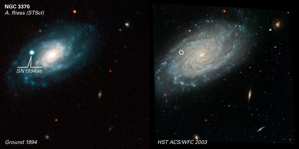 The image on the right is from HST 9 years later, by which time the supernova can no longer be detected. Many interesting features of the host as well as other background galaxies are blurred beyond recognition by the atmosphere in the ground-based image. HST, which sits above the distorting atmosphere, captures great detail at exquisite resolution.