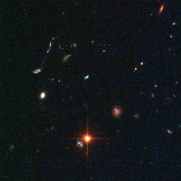 In the lower middle right, a distant filament of merging blue galaxies can be seen.