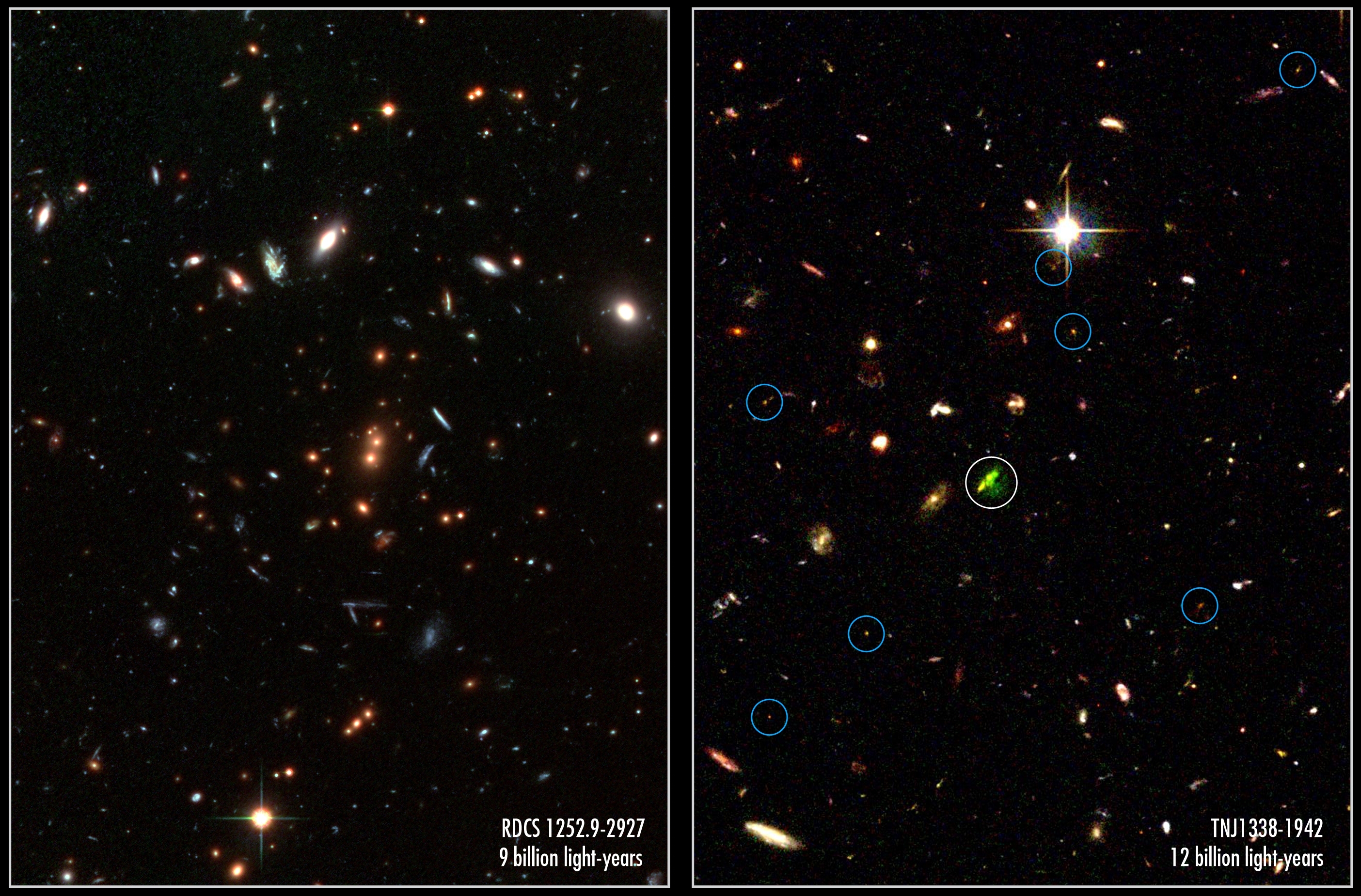 Credits for RDCS1252: NASA, ESA, J. Blakeslee (Johns Hopkins University), M. Postman (Space Telescope Science Institute) and P. Rosati, Chris Lidman & Ricardo Demarco (European Southern Observatory)