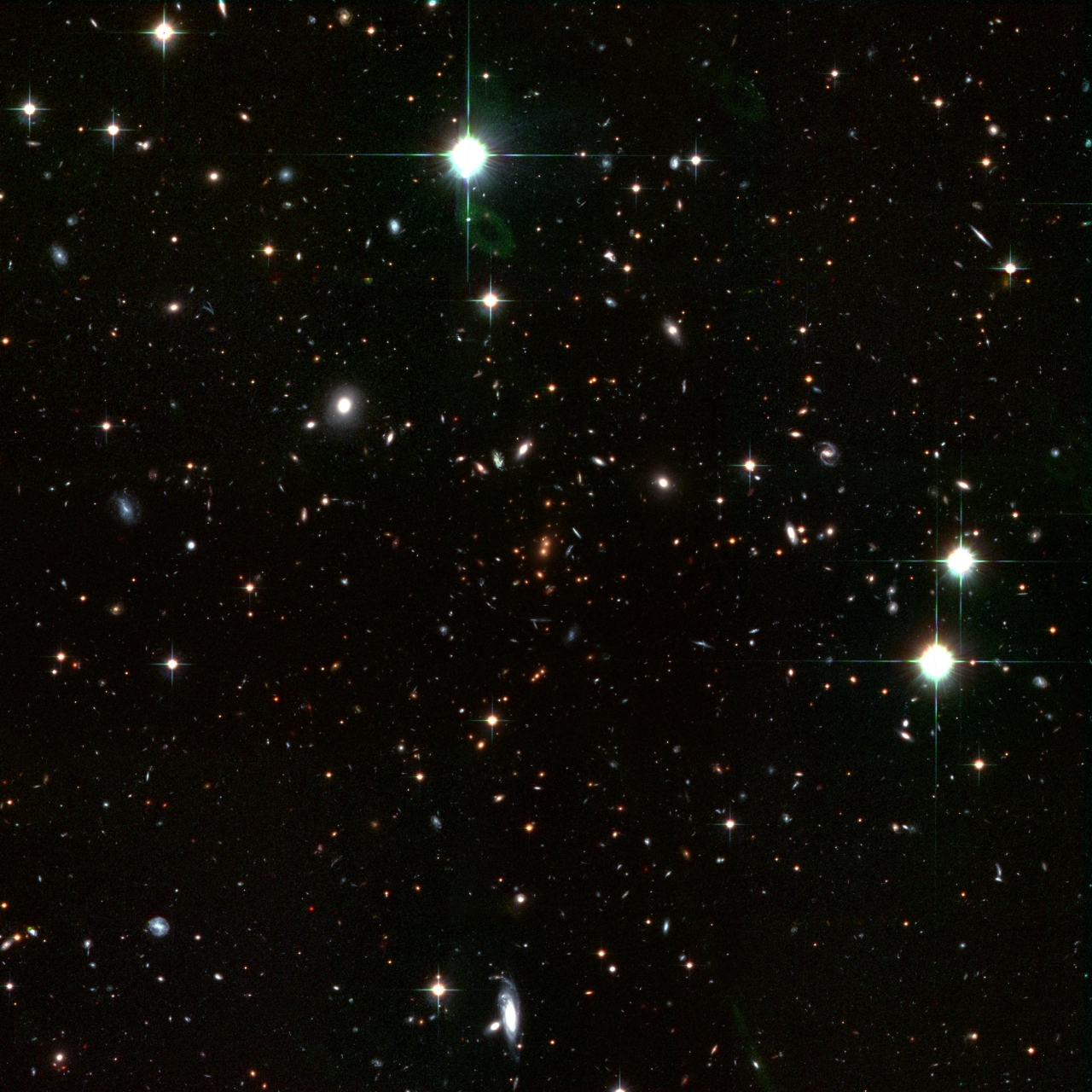 Copyright: NASA, ESA, J. Blakeslee (Johns Hopkins University), M. Postman (Space Telescope Science Institute) and P. Rosati, Chris Lidman & Ricardo Demarco (European Southern Observatory)