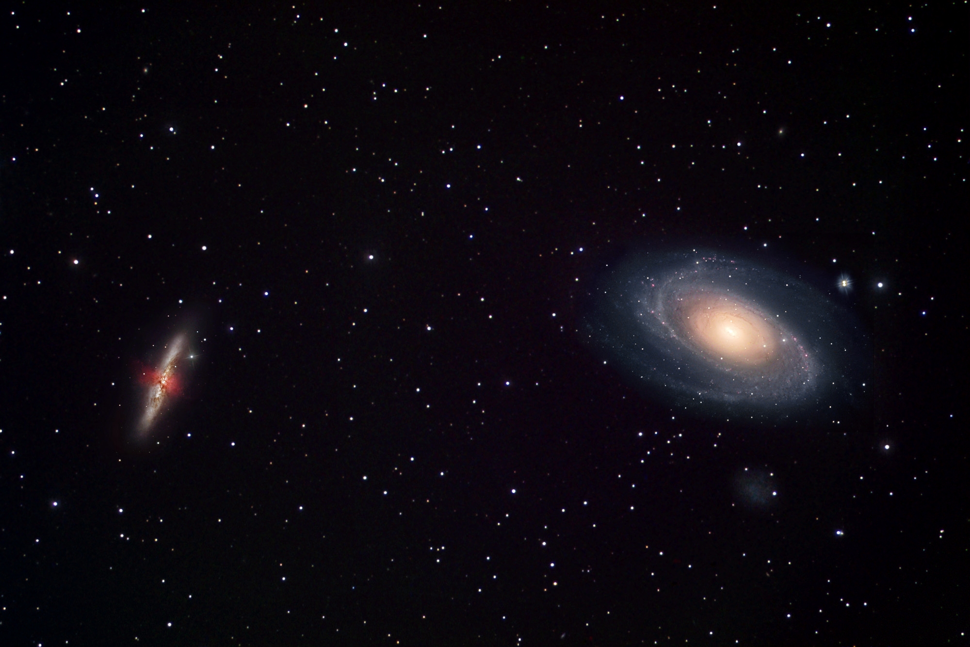 This wide-angle image taken by astrophotographer Robert Gendler shows the amazing duo of Messier 81 (right) and Messier 82 (left). These two mighty galaxies in the Plough (Ursa Major) belong to some of the most famous and beloved galaxies known to amateur astronomers. This may be one of the reasons that Supernova 1993J was discovered by the Spanish amateur astronomer Francisco Garcia Diaz and not a professional astronomer.