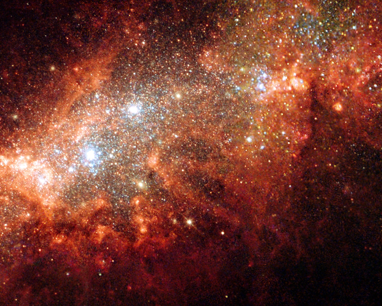 In this new image, taken with the NASA/ESA Hubble Space Telescope, the bubble structure is sculpted by the galactic super-winds and outflows caused by a colossal input of energy from collective supernova explosions that are linked with a massive episode of star birth.
