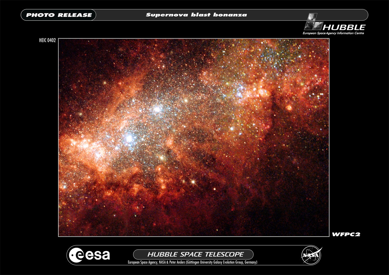 In this new image, taken with the NASA/ESA Hubble Space Telescope, The bubble structure is sculpted by the galactic super-winds and outflows caused by a colossal input of energy from collective supernova explosions that are linked with a massive episode of star birth.