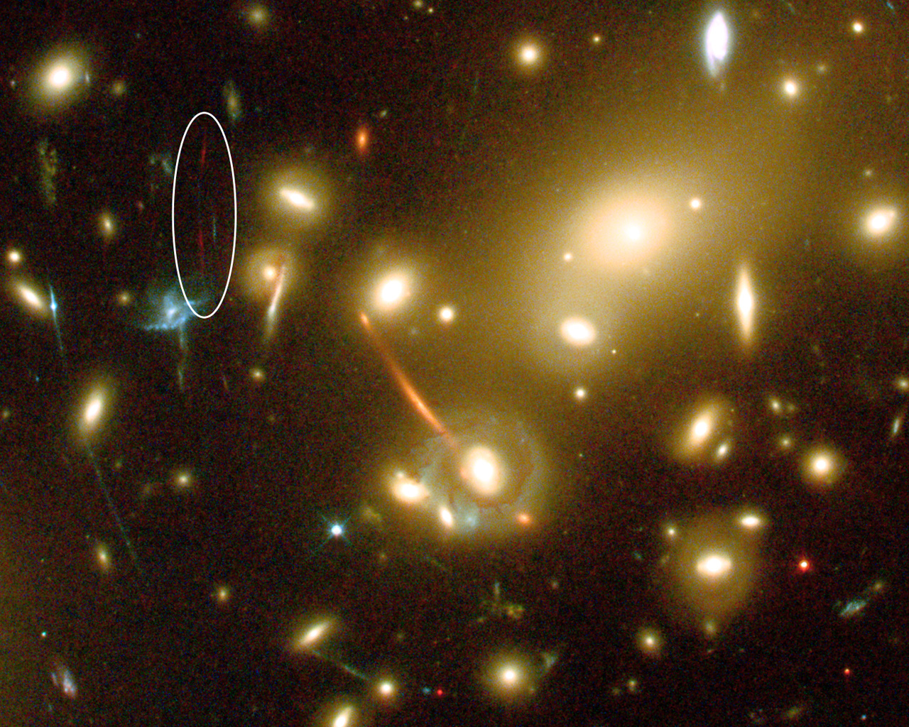 A new galaxy (split into two 'images' marked with an ellipse and a circle) was detected in this image taken with the Advanced Camera for Surveys on board the NASA/ESA Hubble Space Telescope. The extremely faint galaxy is so far away that its visible light has been stretched into infrared wavelengths, making the observations particularly difficult.