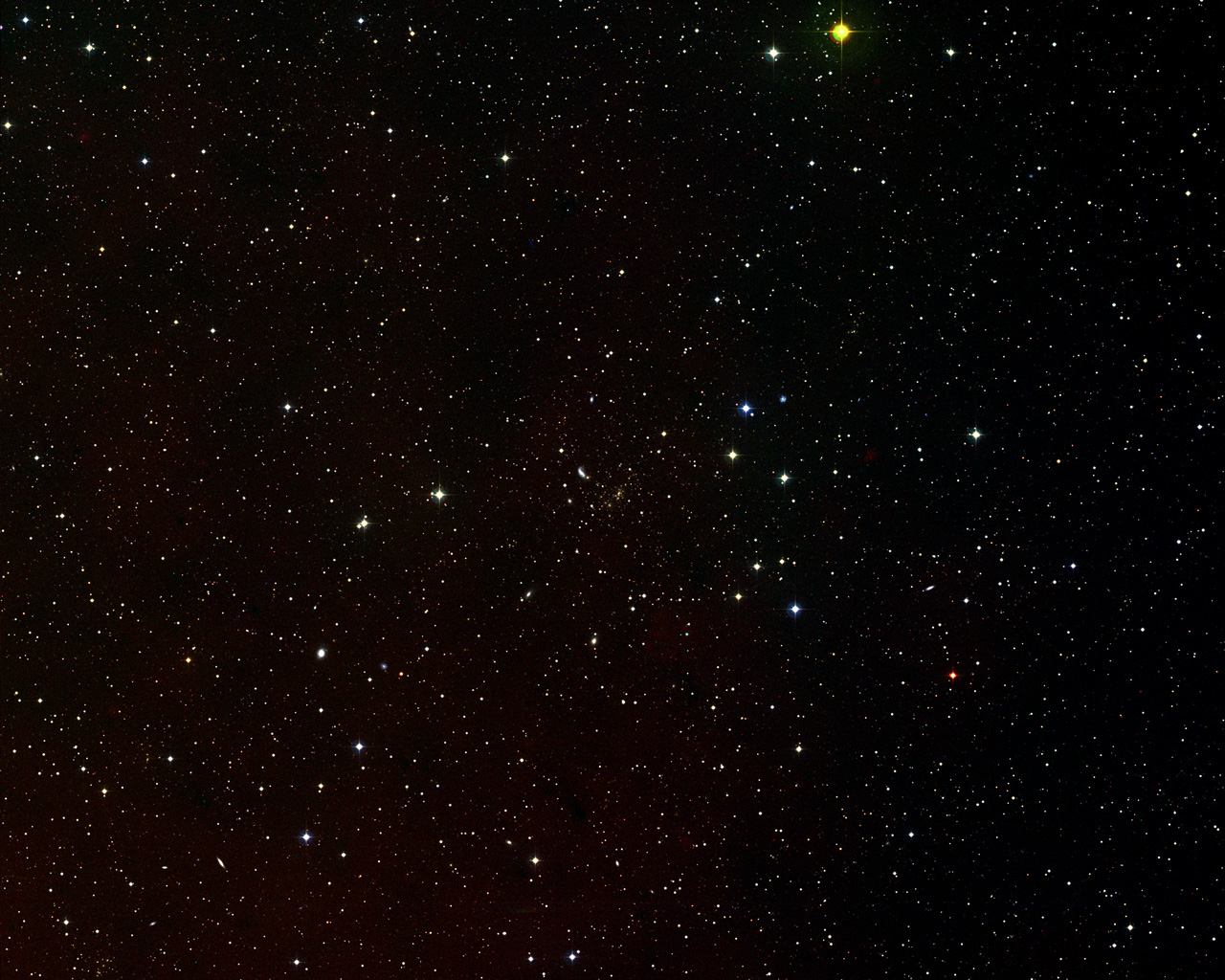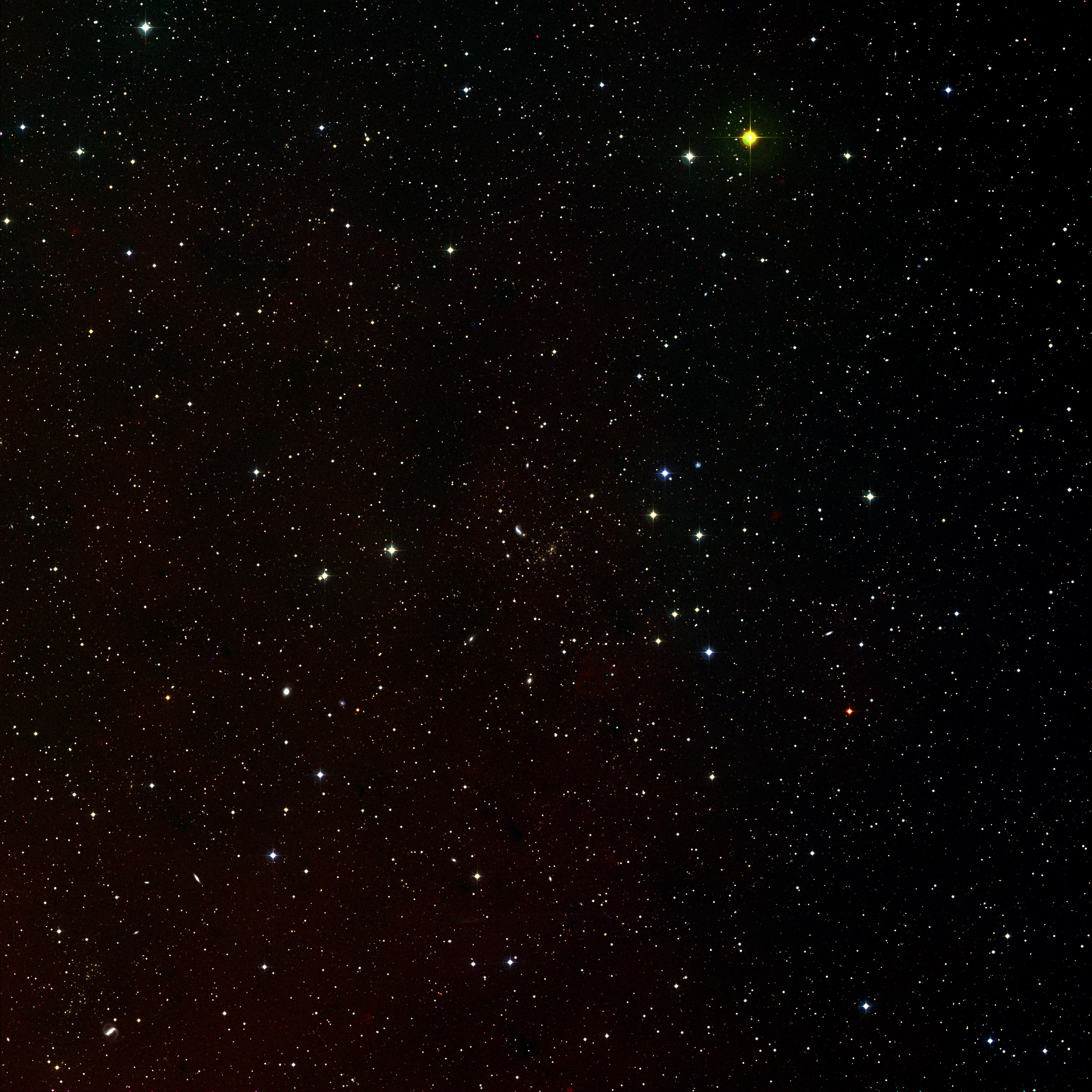This image is composited from blue, red and infrared exposures from the Digitized Sky Survey 2 and shows 1.5 x 1.5 degrees centered on galaxy cluster Abell 2218.