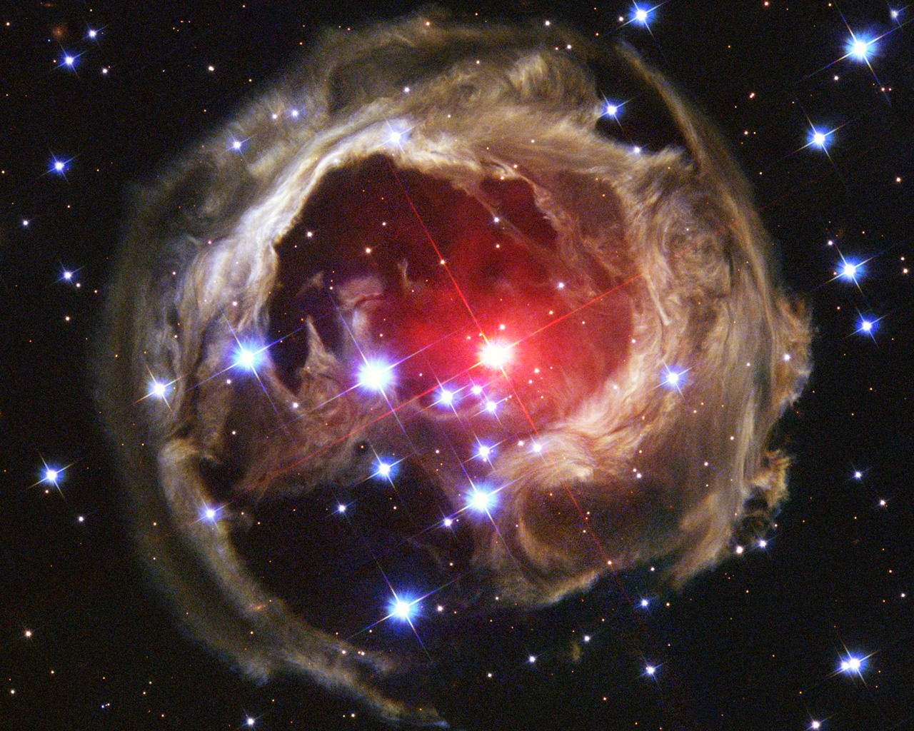 This image, obtained with the Advanced Camera for Surveys on February 8, 2004, is Hubble's latest view of an expanding halo of light around a distant star, named V838 Monocerotis (V838 Mon). The illumination of interstellar dust comes from the red supergiant star at the middle of the image, which gave off a flashbulb-like pulse of light two years ago. V838 Mon is located about 20 000 light-years away from Earth in the direction of the constellation Monoceros, placing the star at the outer edge of our Milky Way galaxy.