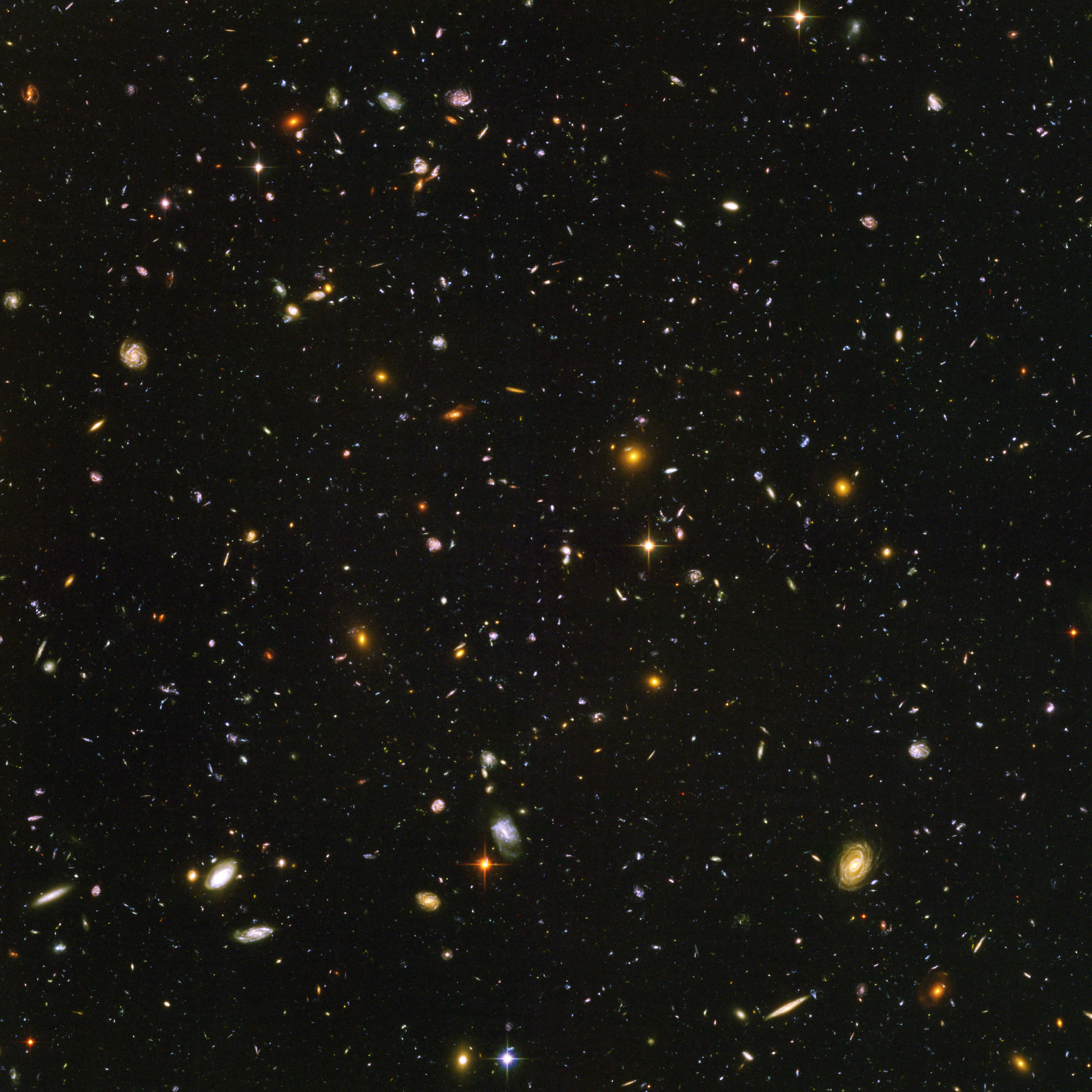 The snapshot includes galaxies of various ages, sizes, shapes, and colours. The smallest, reddest galaxies, about 100, may be among the most distant known, existing when the universe was just 800 million years old. The nearest galaxies - the larger, brighter, well-defined spirals and ellipticals - thrived about 1 billion years ago, when the cosmos was 13 billion years old.