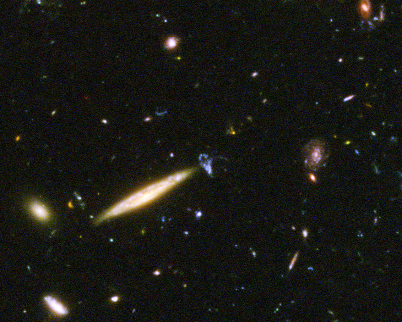 A galactic brawl. A close encounter with a spiral galaxy. Blue wisps of galaxies. These close-up snapshots of galaxies in the Hubble Ultra Deep Field reveal the drama of galactic life. Here an edge-on spiral galaxy fending off a weirdly shaped blue galaxy. .