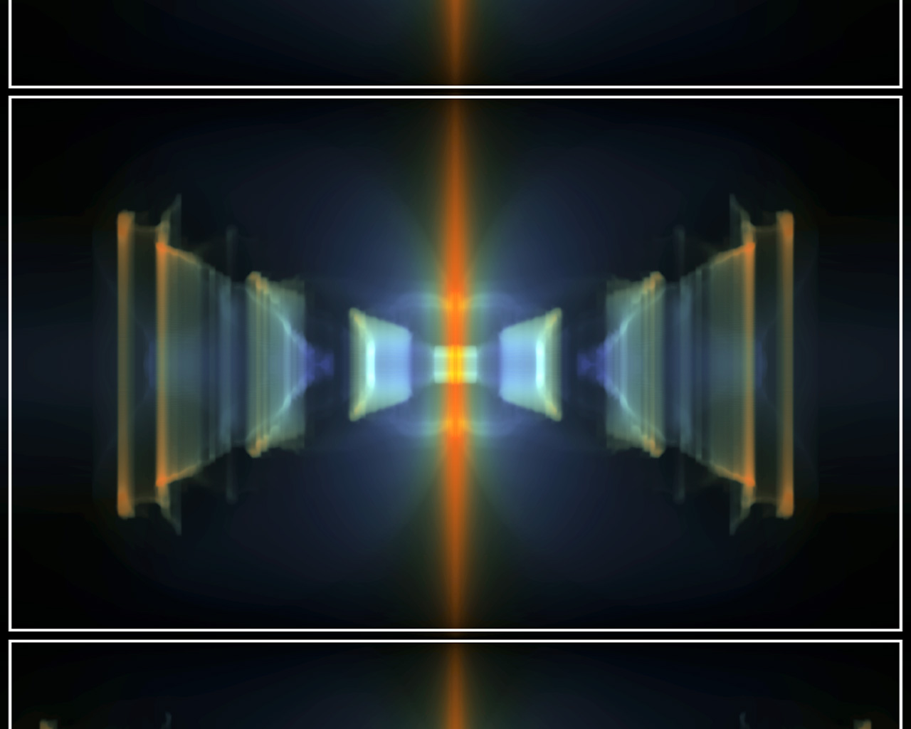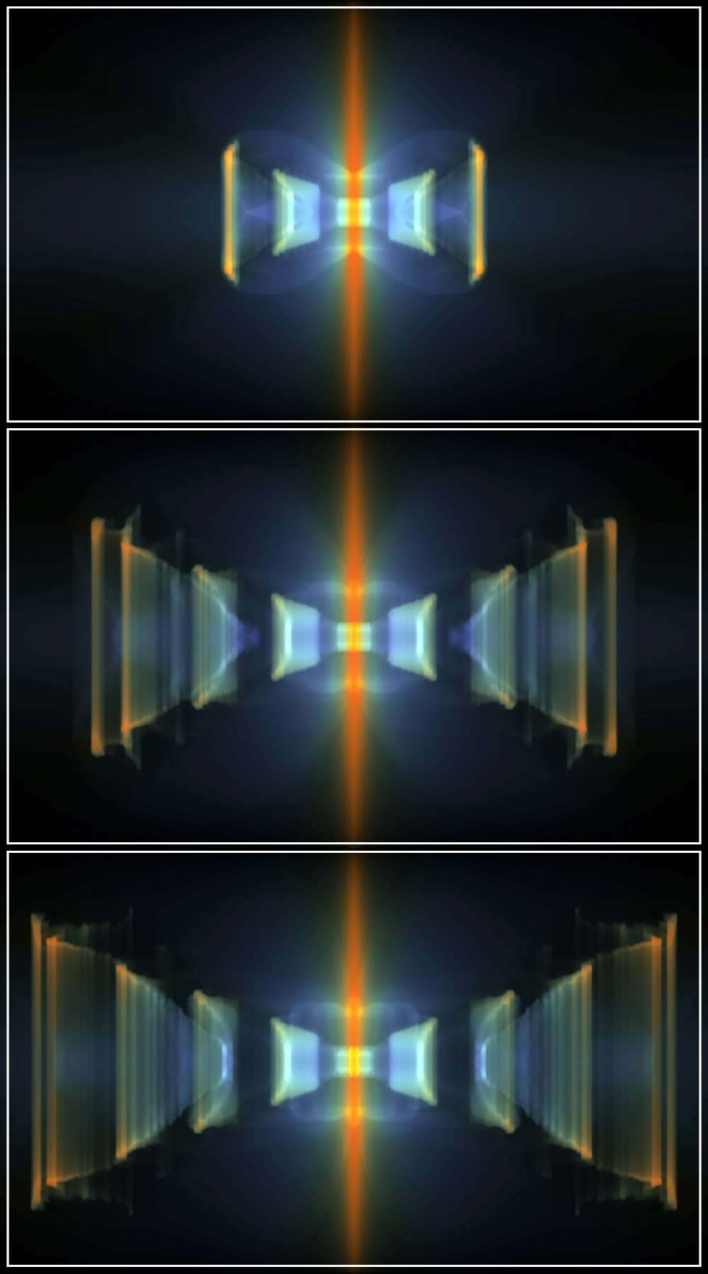 Of the many different parameters in Vincent Icke's calculations, only the density of the gas and the dust are observed in the Hubble image. The reflection of the gas and dust are shown in this simulated image. The colours show what one would see in scattered light. Blue light scatters more than red (the same process that makes the sky blue and sunsets red here on Earth). The ejected blobs of gas and dust look reddish, the background nebula is whiter. The three images are a time sequence with about 600 years between and show how the Red Rectangle may have been created. Image number 3 shows a state similar to how we observe the Red Rectangle with Hubble.