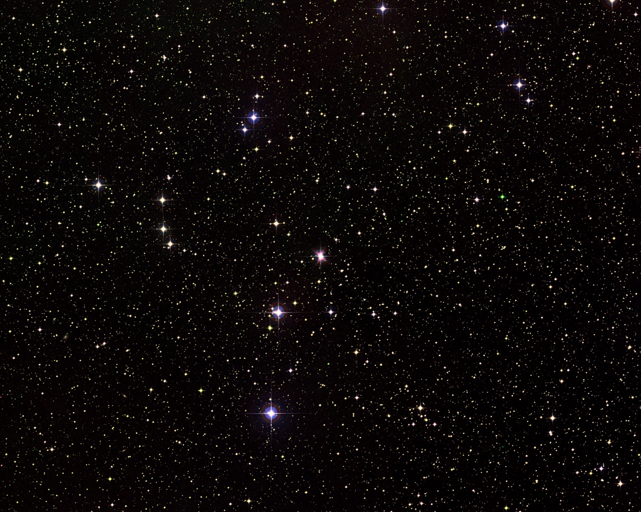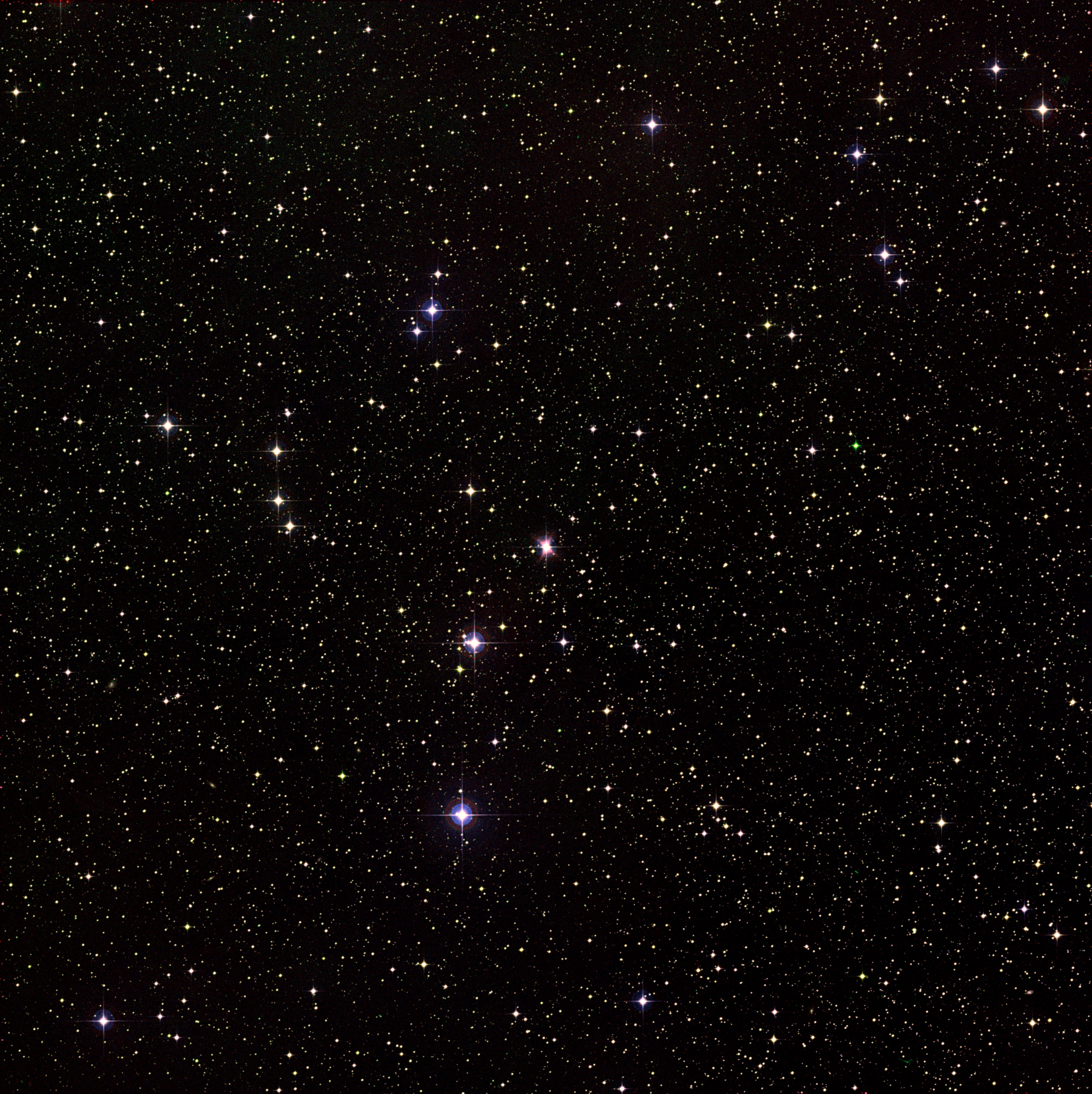 This is a ground-based view of the sky around the Red Rectangle. The image spans a square of one degree and was constructed from three images from the Digitized Sky Survey 2 taken in Blue, Infrared and Red (shown as blue, green and red respectively). Note that the HST picture only shows the innermost part of the nebula.