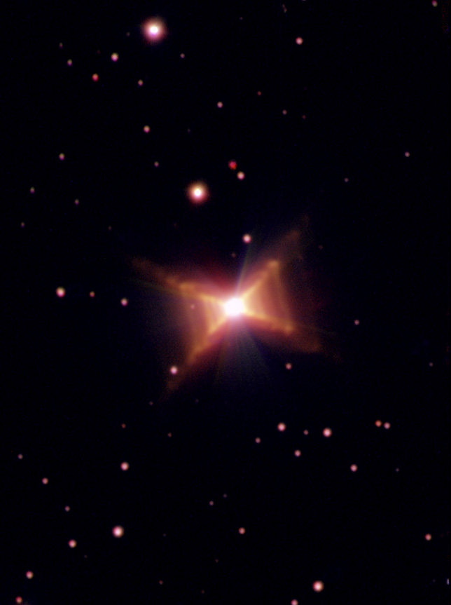 This ground-based image was taken with the European Southern Observatory's New Technology Telescope at La Silla Observatory. The image is constructed from three exposures through a blue filter, Hydrogen-alpha filter and a red filter. Note that the HST picture only shows the innermost part of the nebula.