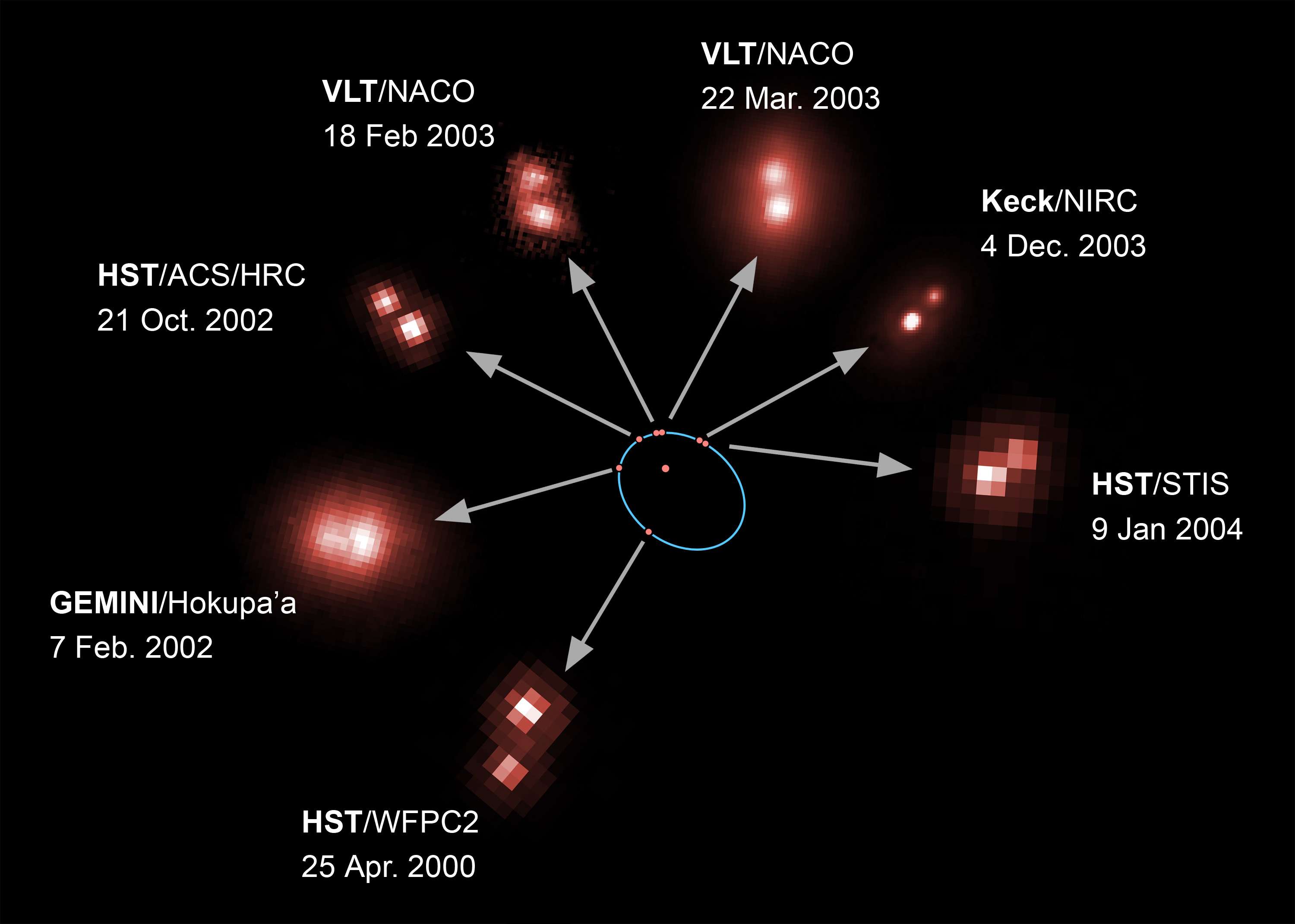 This image shows the orbit of the brown dwarf around the ultra-cool L-dwarf. Each red dot on the orbit (in blue) corresponds to one observation made with a ground- or space-based telescope. The observations cover 60% of the whole orbit.
