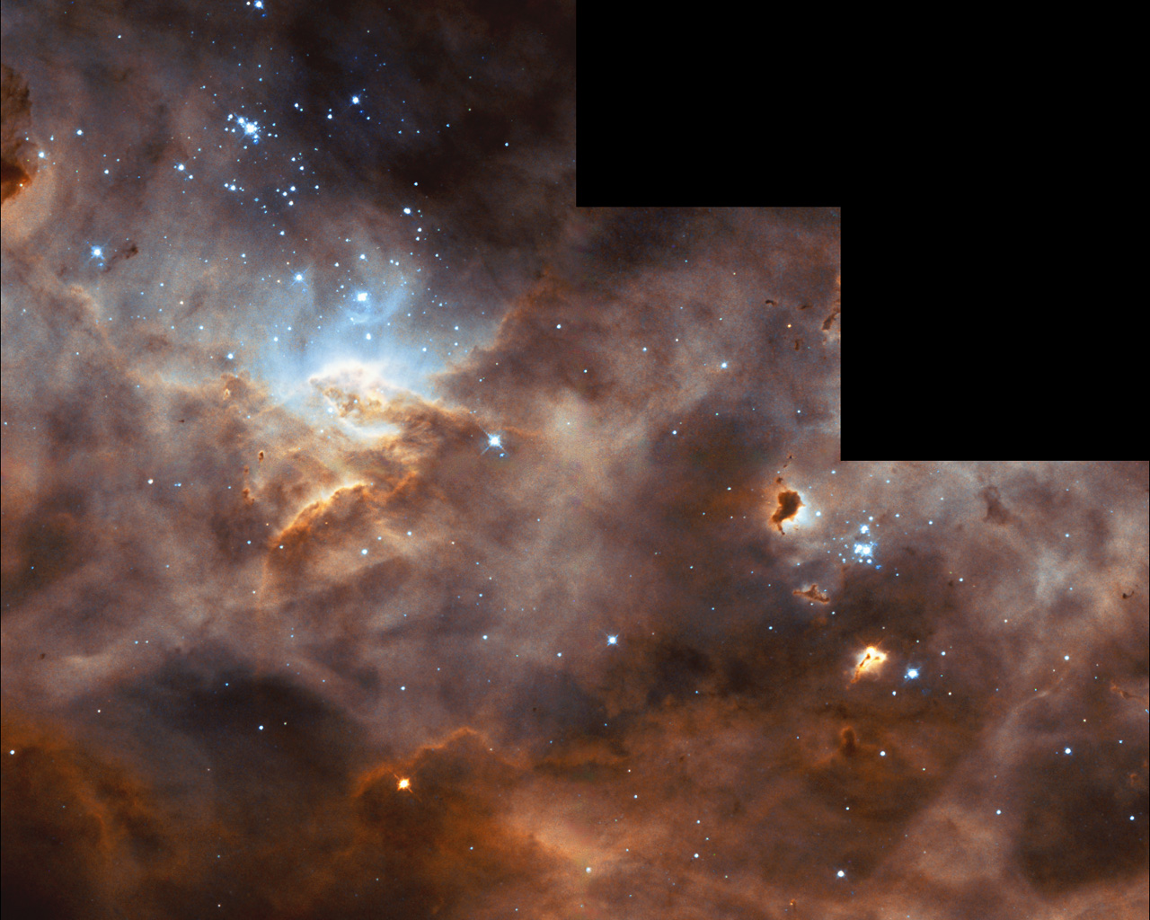 The NASA/ESA Hubble Space Telescope captures the iridescent tapestry of star birth in a neighbouring galaxy in this panoramic view of glowing gas, dark dust clouds, and young, hot stars. The star-forming region, catalogued as N11B lies in the Large Magellanic Cloud (LMC), located only 160 000 light-years from Earth. With its high resolution, the Hubble Space Telescope is able to view details of star formation in the LMC as easily as ground-based telescopes are able to observe stellar formation within our own Milky Way galaxy.