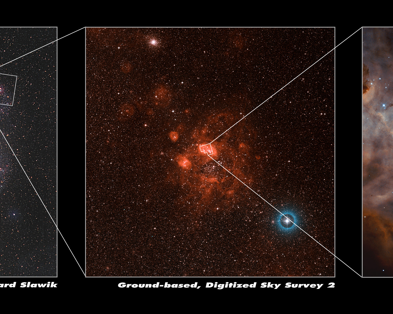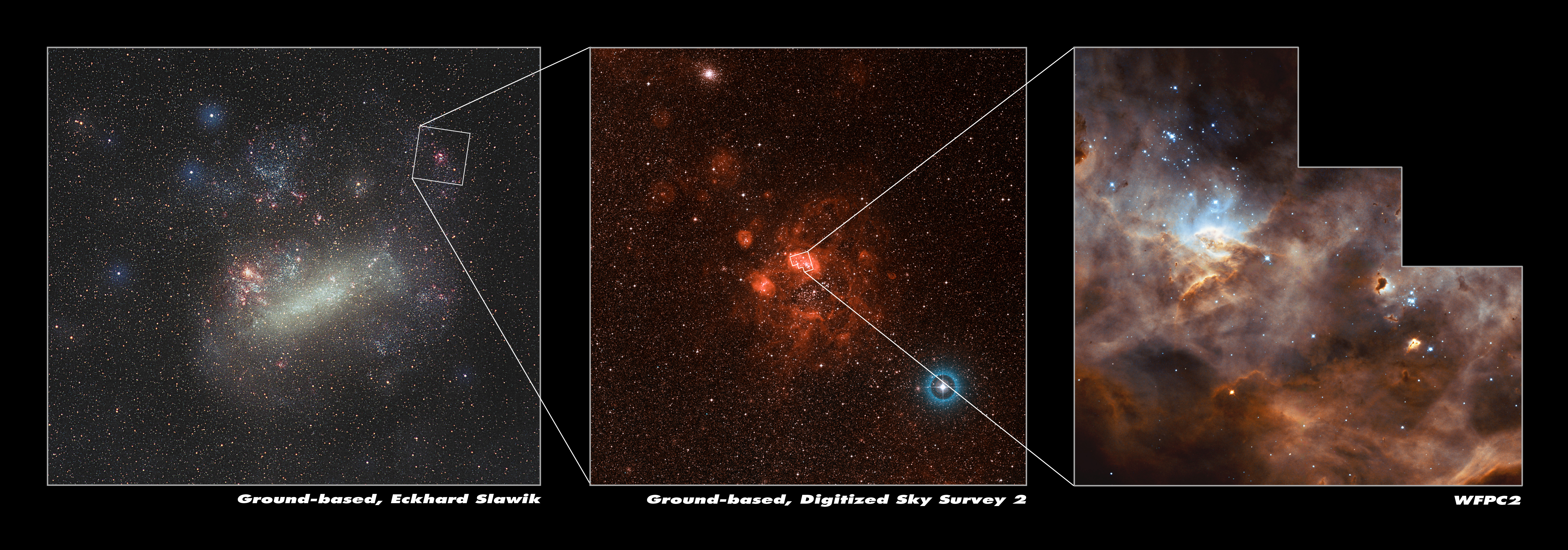 To the upper right is a ground-based image zoomed closer on N11B in the Large Magellanic Cloud. The image spans a square of one degree and was constructed from two images from the Digitized Sky Survey 2 taken through infrared and red filters (shown as blue and red respectively). The frame indicates the field of Hubble's Wide Field Planetary Camera 2 seen at the bottom of the panel.