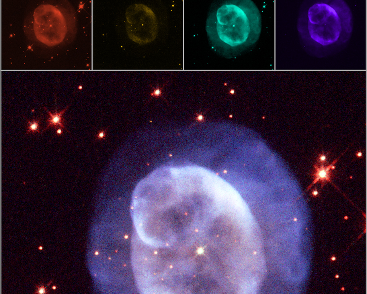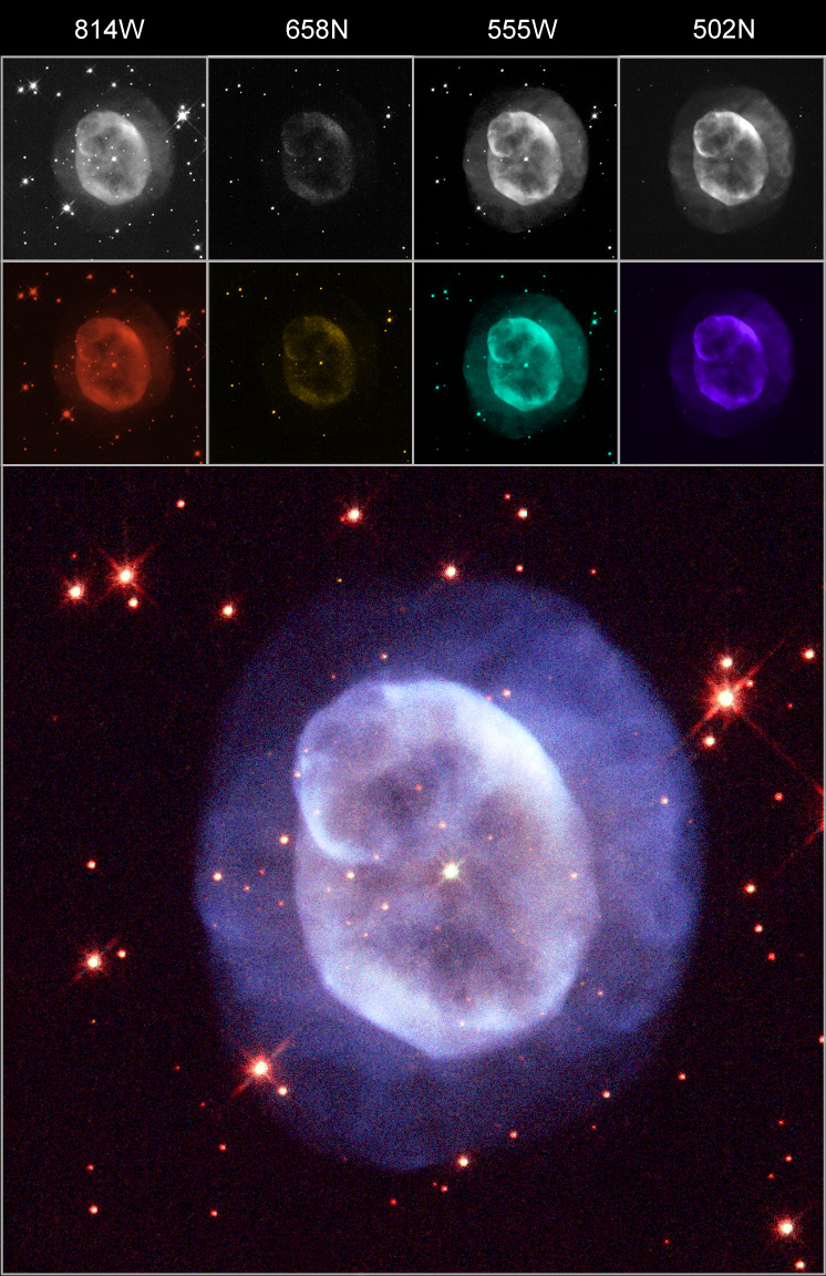 This previously unreleased colour image of the planetary nebula NGC 5979 was combined from raw FITS files with the ESA/ESO/NASA Photoshop FITS Liberator. In the top row the raw greyscale images are seen. Four individual exposures were combined to form this colour image and the colour filters for the individual exposures are indicated. The number refers to the colour, or wavelength, of light that the filter allows through. This is measured in nanometres (a millionth of a millimetre). The N's and W's in the filter name refer to whether the filter is a narrow-band (N) or a wide-band filter (W). The second row shows the individual exposures after a colorising layer has been applied in Photoshop.