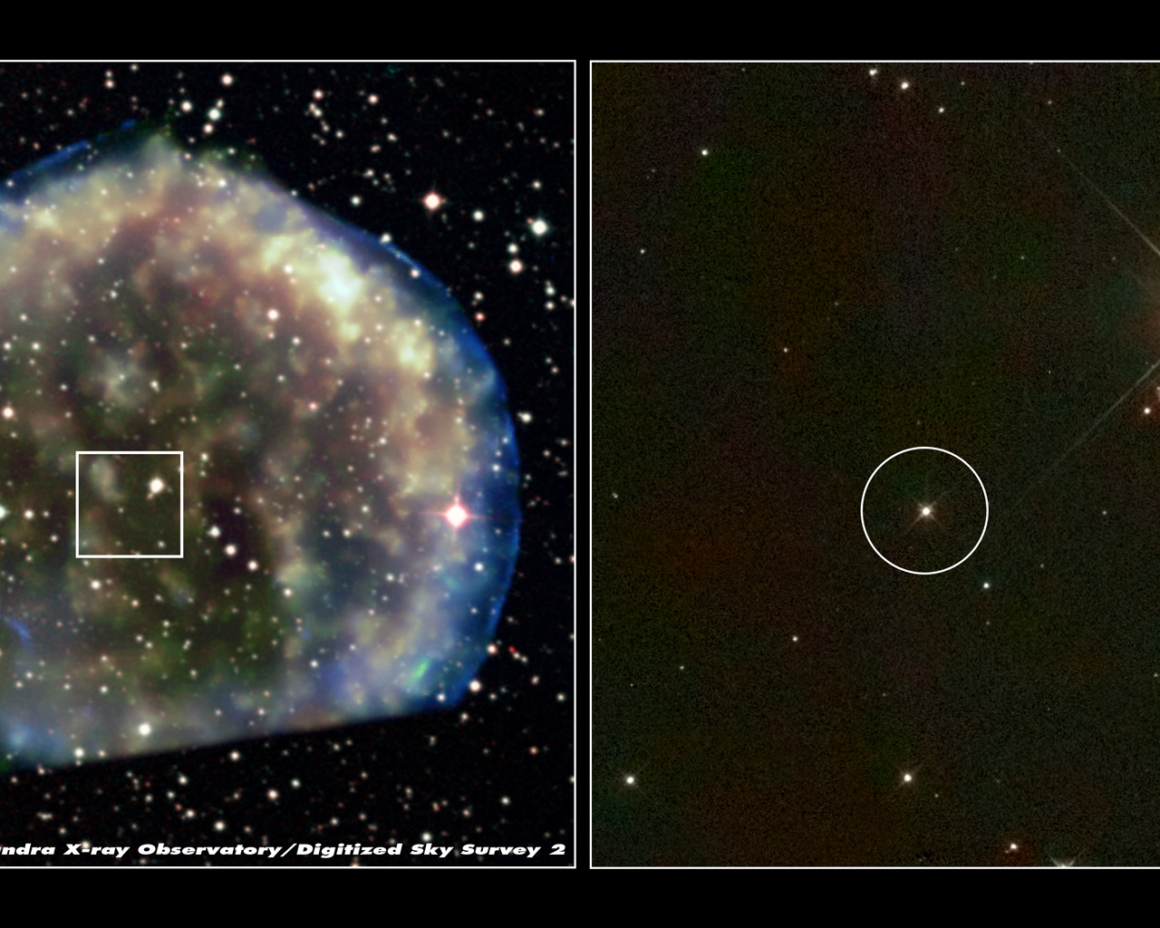 The Hubble view is superimposed on this wide-field view of the region enveloped by the expanding bubble of the supernova explosion; the bubble and candidate star are at approximately the same distance, 10 000 light-years. The star is noticeably offset from the geometric centre of the bubble. The colours in the Chandra X-Ray image of the hot bubble show different X-ray energies, with red, green, and blue representing low, medium, and high energies, respectively. (The image is cut off at the bottom because the southernmost region of the remnant fell outside the field of view of the Chandra camera.)