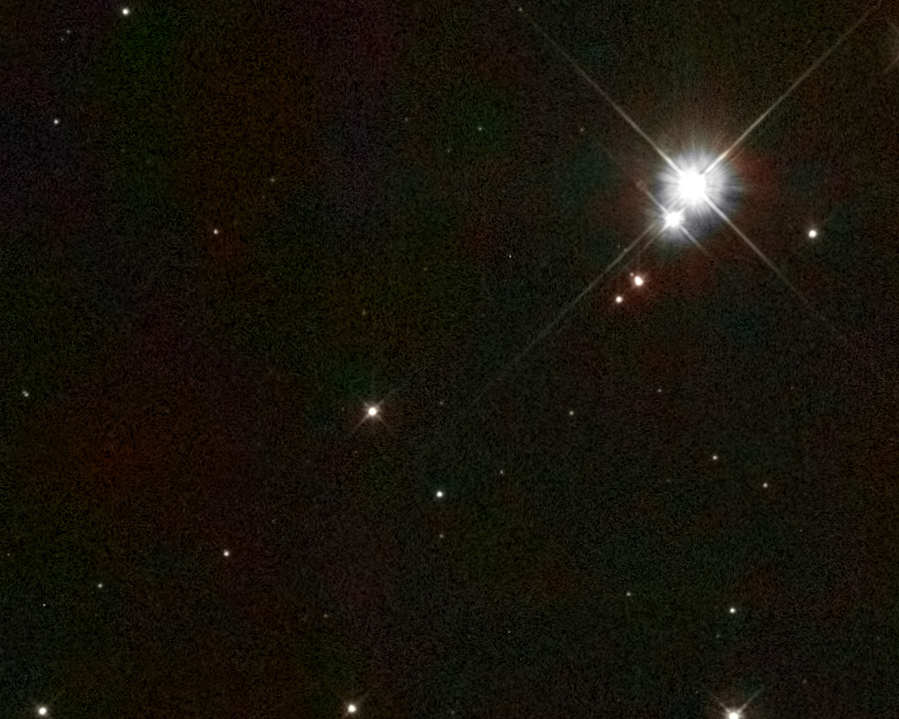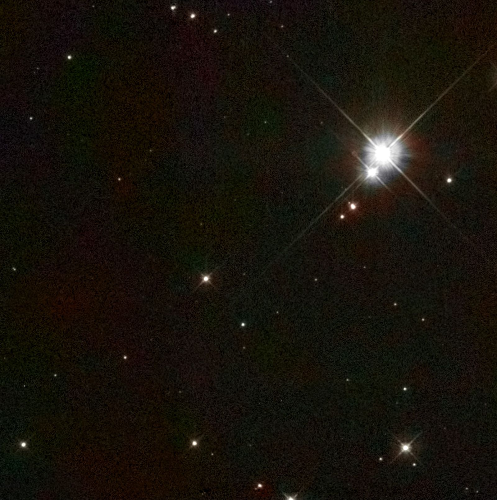 A Hubble Space Telescope Wide Field Planetary Camera 2 image of a small section of sky containing a suspected runaway companion star to a titanic supernova explosion witnessed in the year 1572 by the great Danish astronomer Tycho Brahe. The star is like our Sun except several billion years older. It is moving through space at three times the speed of the other stars in its neighbourhood. Hubble's sharp view allowed for a measurement of the star's motion, based on images taken in 1999 and 2003. The image consists of a single greyscale Hubble exposure colorized with the help of data from Digitized Sky Survey 2.
