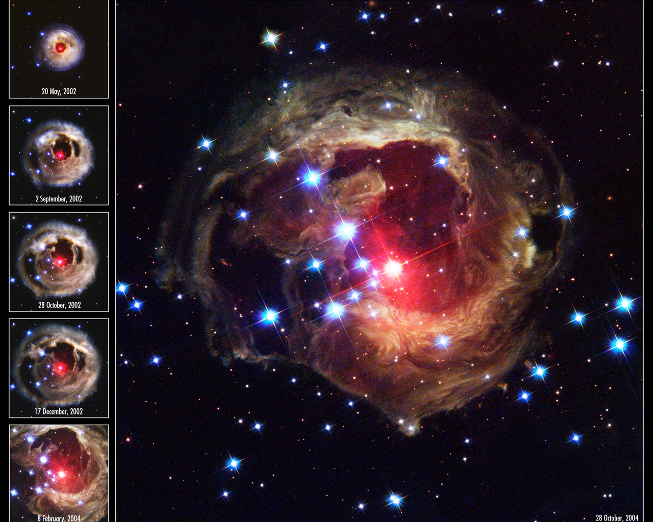 The Hubble Space Telescope's latest image of the star V838 Monocerotis (V838 Mon) reveals dramatic changes in the illumination of surrounding dusty cloud structures. The effect, called a light echo, has been unveiling never-before-seen dust patterns ever since the star suddenly brightened for several weeks in early 2002.