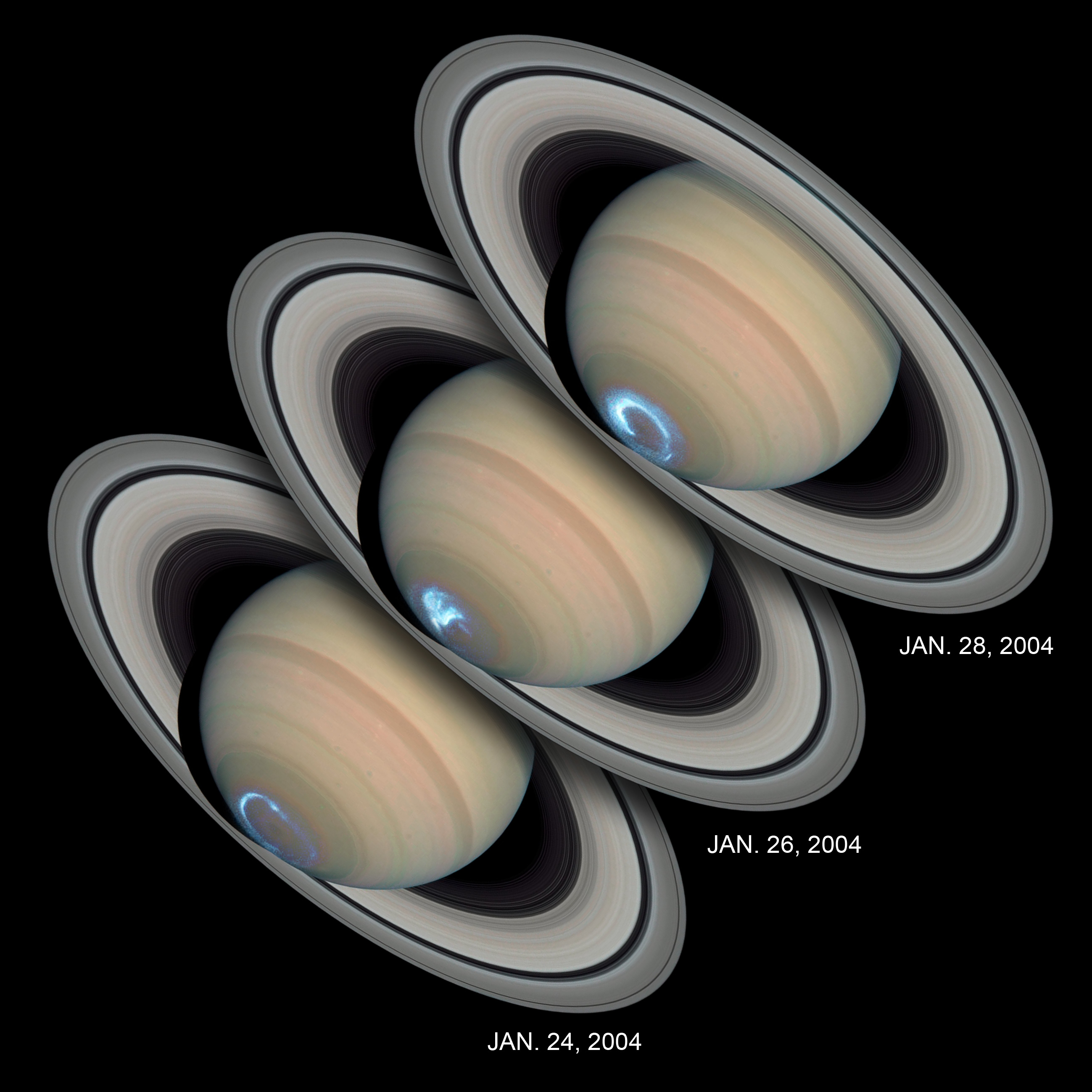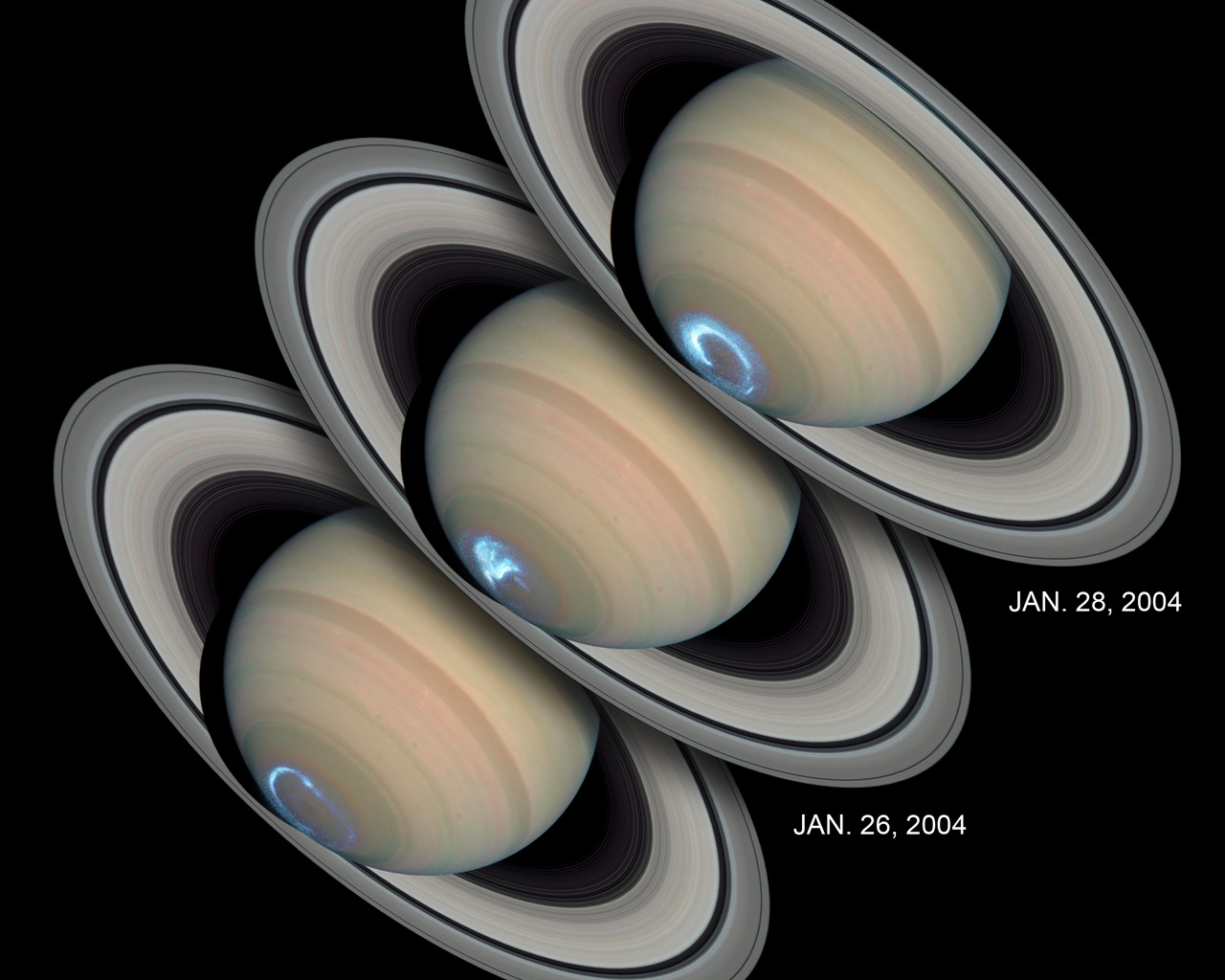 These images reveal the dynamic nature of Saturn's aurorae. Viewing the planet's southern polar region for several days, ESA/NASA Hubble Space Telescope snapped a series of photographs of the aurora dancing in the sky. The snapshots show that Saturn's aurorae differ in character from day to day, as they do on Earth, moving around on some days and remaining stationary on others. But compared with Earth, where auroral storms develop in about 10 minutes and may last for a few hours, Saturn's auroral displays always appear bright and may last for several days.