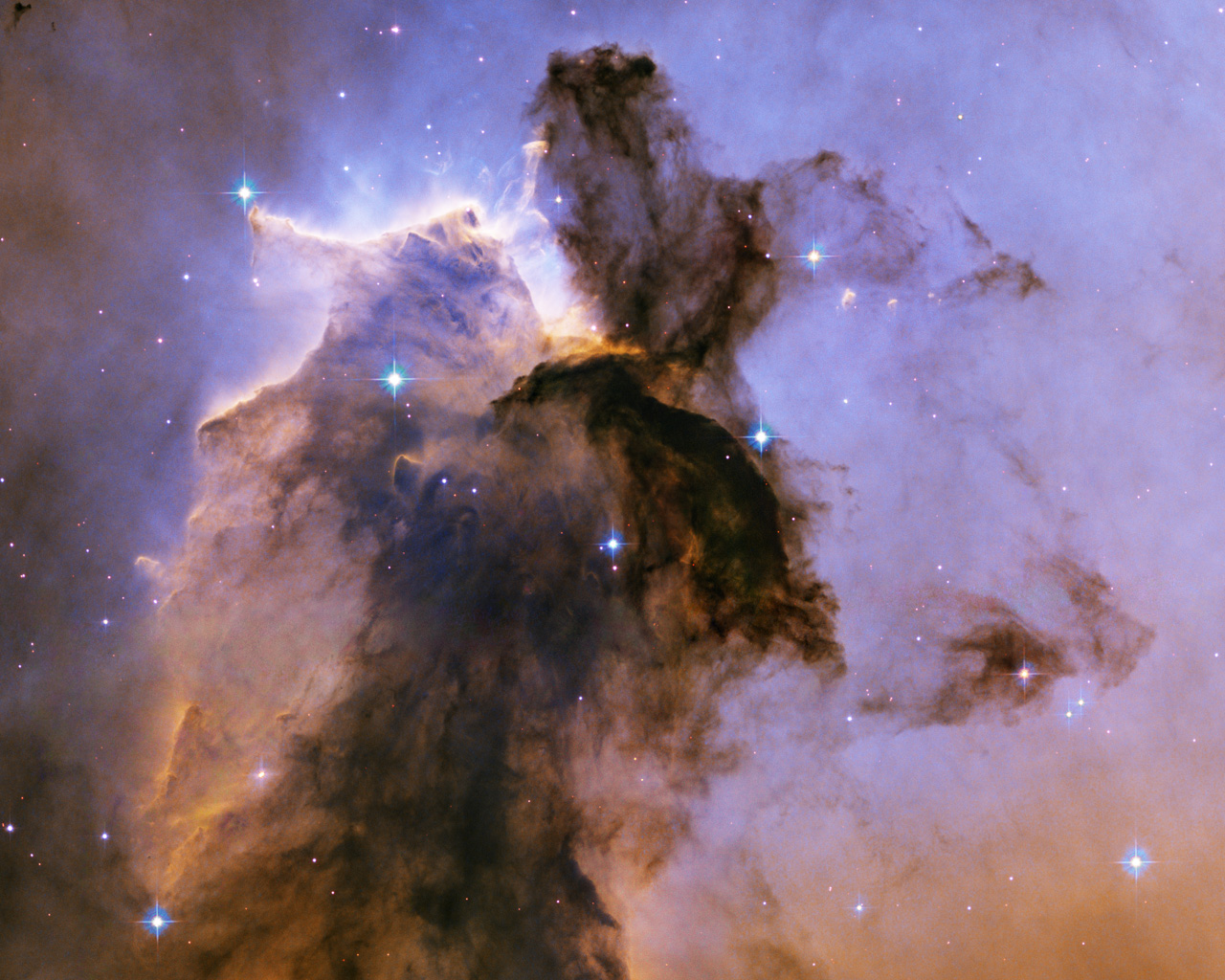 The bumps and fingers of material in the centre of the tower are examples of these stellar birthing areas. These regions may look small but they are roughly the size of our solar system. The fledgling stars continued to grow as they fed off the surrounding gas cloud. They abruptly stopped growing when light from the star cluster uncovered their gaseous cradles, separating them from their gas supply.