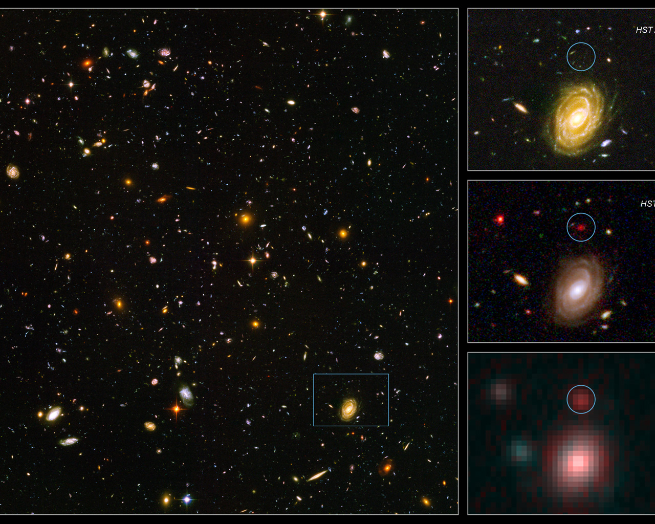Left: The galaxy, named HUDF-JD2, was pinpointed among approximately 10 000 others in a small area of sky called the Hubble Ultra Deep Field (HUDF). This is the deepest image of the universe ever made at optical and near-infrared wavelengths.