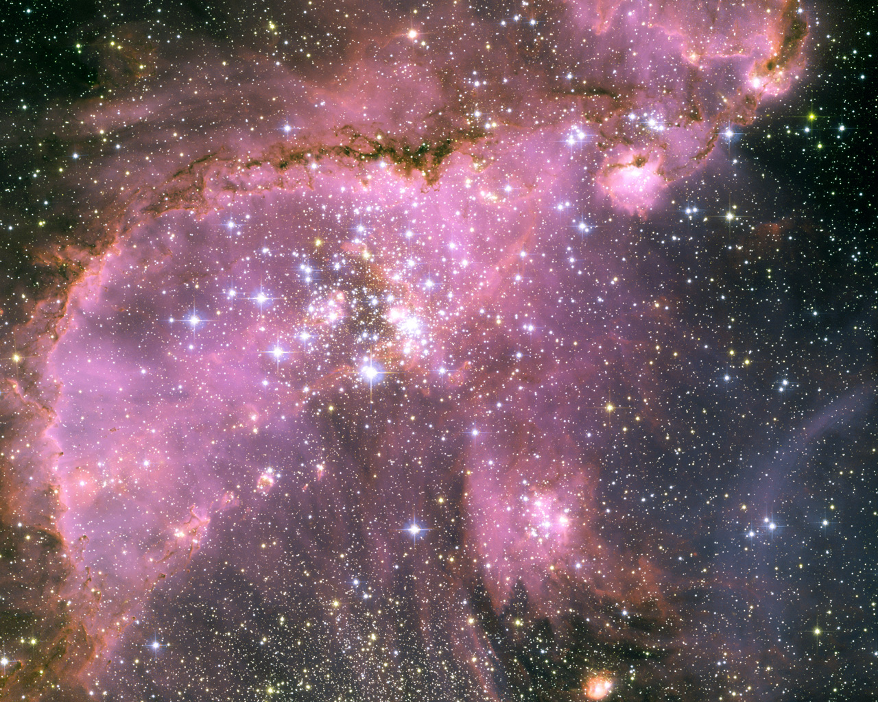 This Hubble Space Telescope view shows one of the most dynamic and intricately detailed star-forming regions in space, located 210 000 light-years away in the Small Magellanic Cloud (SMC), a satellite galaxy of our Milky Way. At the centre of the region is a brilliant star cluster called NGC 346. A dramatic structure of arched, ragged filaments with a distinct ridge surrounds the cluster.