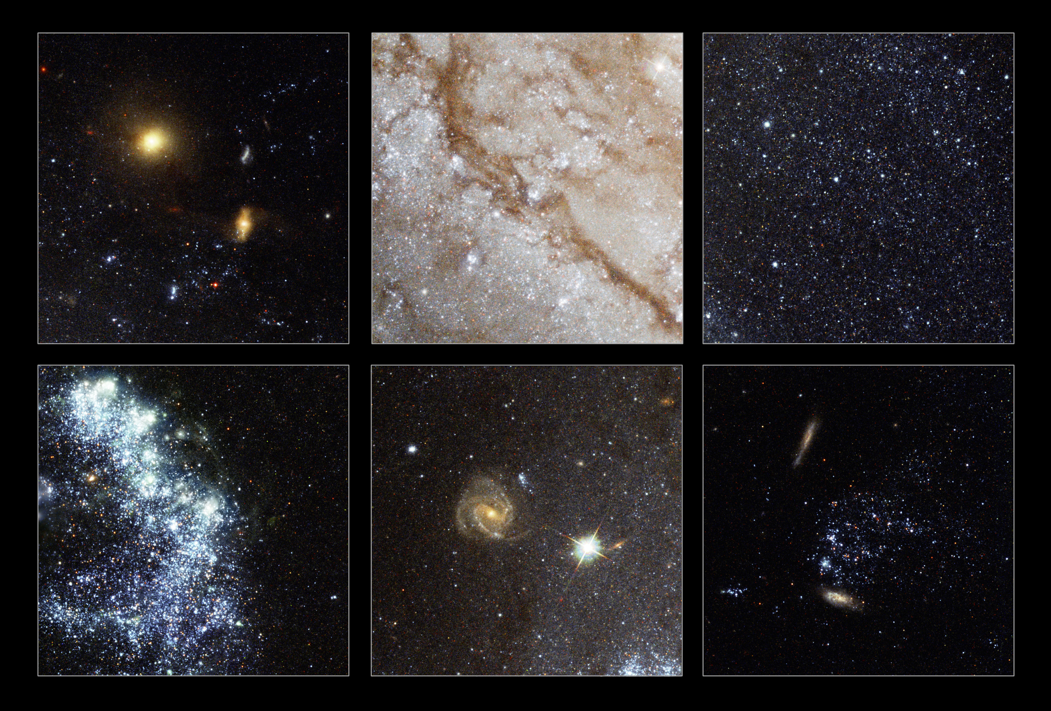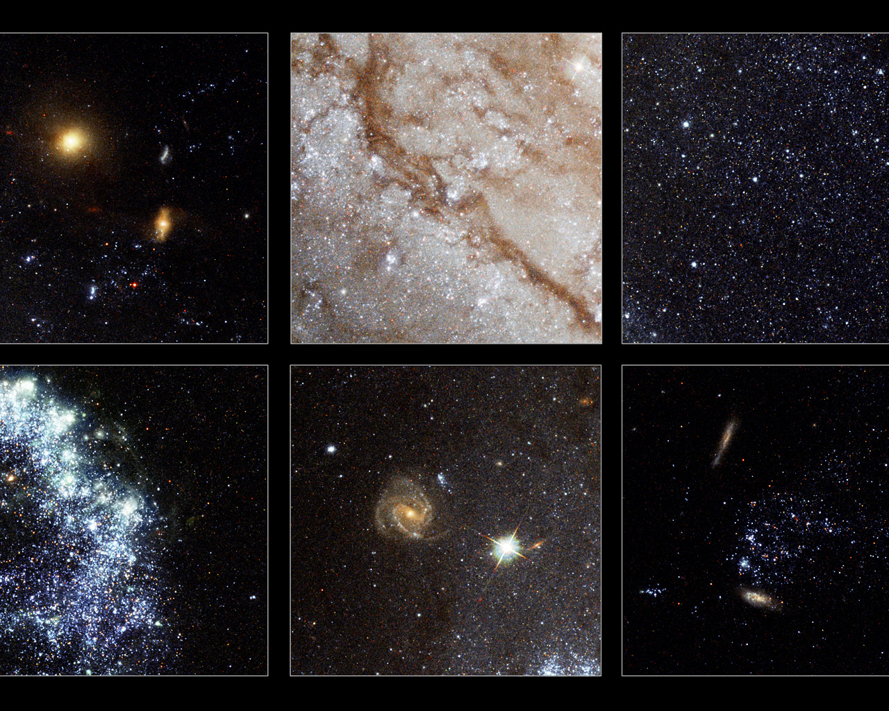 This composite shows six selected areas from the new Hubble image of Messier 101, the Pinwheel Galaxy. The close-ups show: