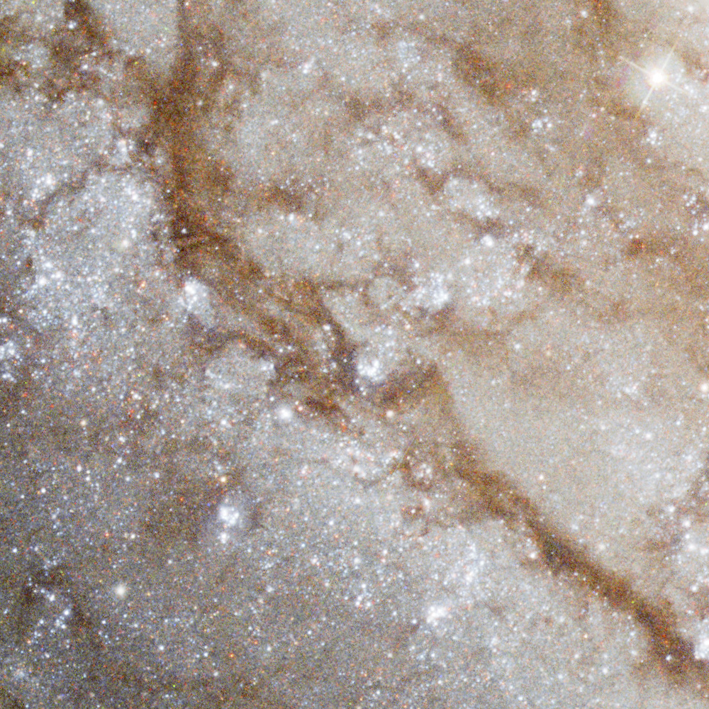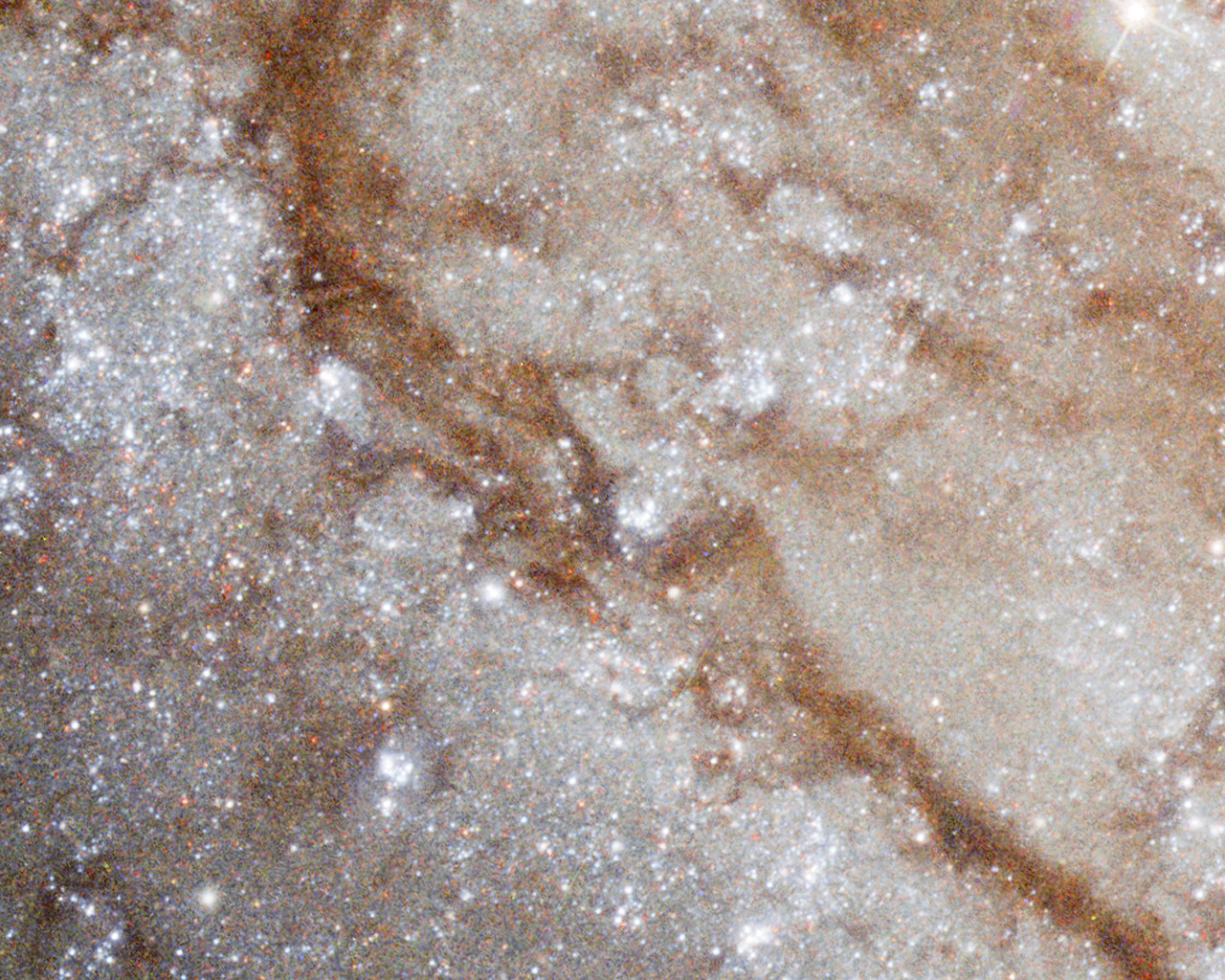 Dust lanes in the Pinwheel galaxy. The dust particles scatter blue light the most and therefore colour the light from background stars red. The same effect is seen in sunsets on the Earth.