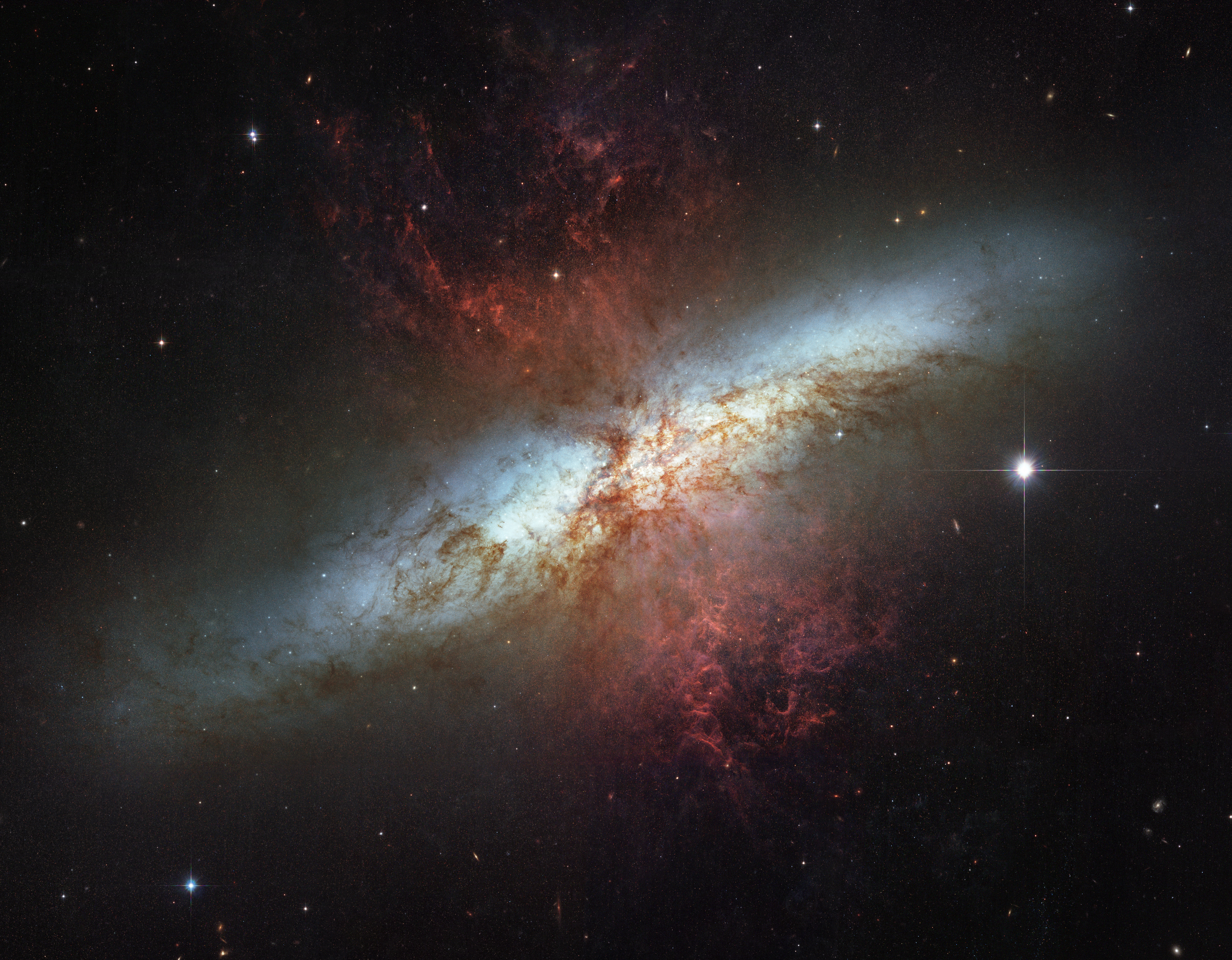 This mosaic image of the magnificent starburst galaxy, Messier 82 (M82) is the sharpest wide-angle view ever obtained of M82. It is a galaxy remarkable for its webs of shredded clouds and flame-like plumes of glowing hydrogen blasting out from its central regions where young stars are being born 10 times faster than they are inside in our Milky Way Galaxy.