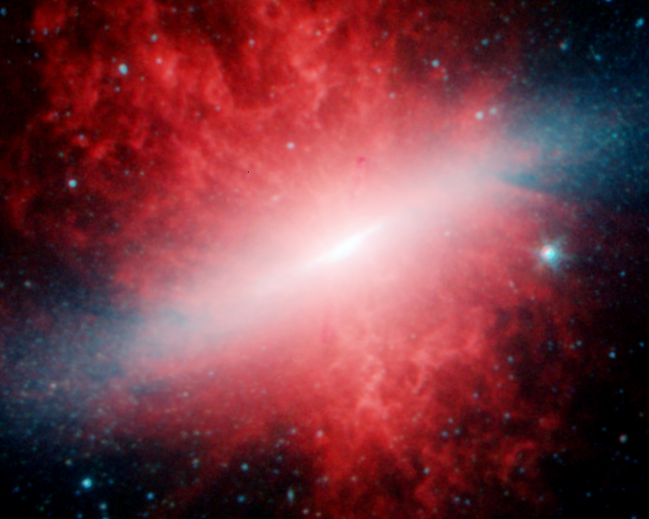 Composite image of the active galaxy Messier 82 from infrared observations by the Spitzer Space Telescope in three wavelength bands coded in red (longest wavelength), green, and blue (shortest wavelengths).