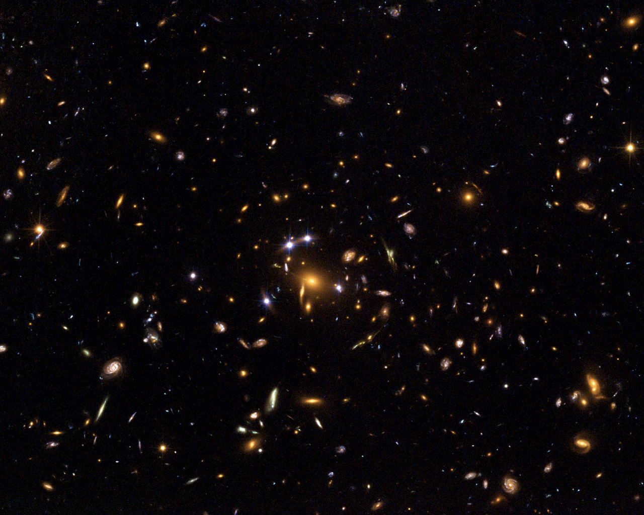 This full-size Hubble image shows galaxy cluster SDSS J1004+4112 that was discovered as part of the Sloan Digital Sky Survey. It is one of the more distant clusters known (seven billion light-years, redshift z=0.68), and is seen when the Universe was half its present age.