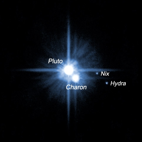 Pluto with its large moon Charon and the recently named two smaller moons that were discovered in May 2005 through Hubble observations. The two smaller moons, named Nix and Hydra, are roughly 5000 times fainter than Pluto and are about two to three times further out from Pluto than Charon.