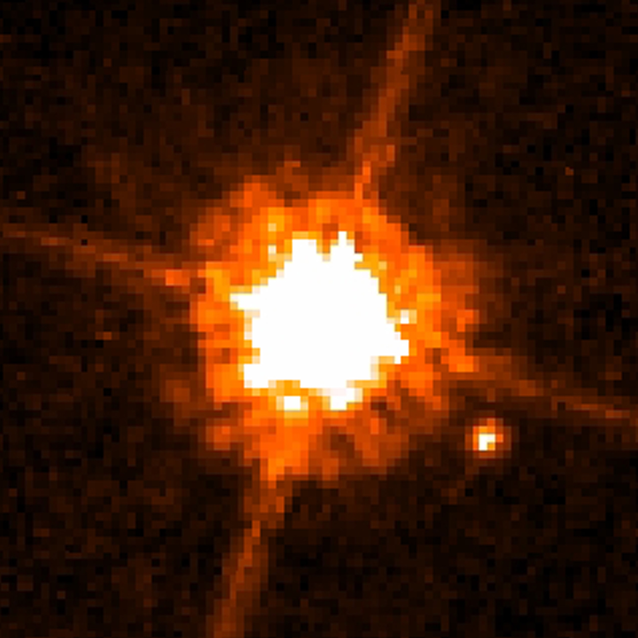 This NASA/ESA Hubble Space Telescope image shows one of the smallest objects ever seen around a normal star. Astronomers believe the object is a brown dwarf because it is 12 times more massive than Jupiter. The brown dwarf candidate, called CHXR 73 B, is the bright spot at lower right. It orbits a red dwarf star, dubbed CHXR 73, which is a third less massive than the Sun. At 2 million years old, the star is very young when compared with our middle-aged 4.6-billion-year-old Sun.