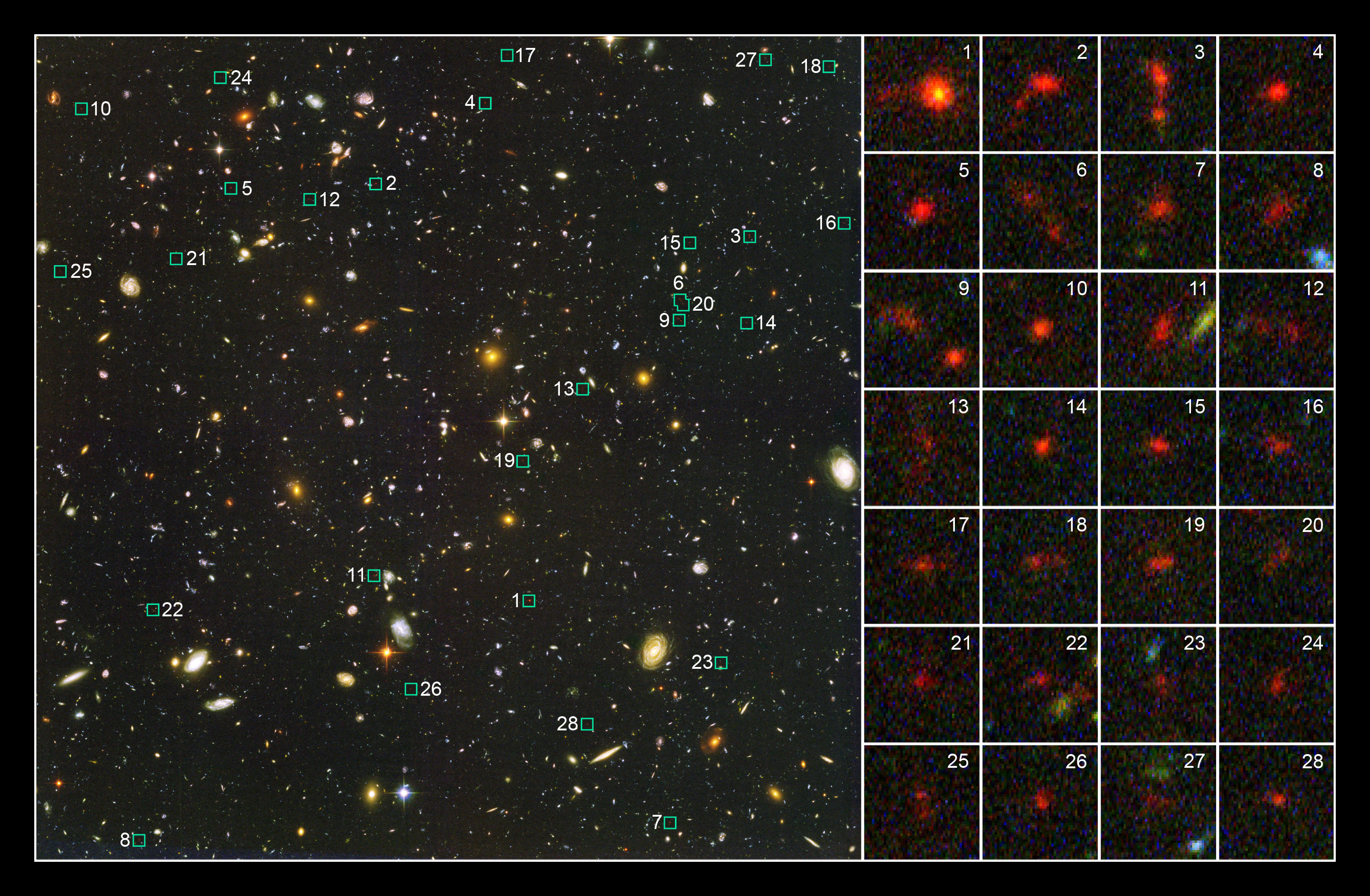 This Hubble Space Telescope image shows 28 of the more than 500 young galaxies that existed when the universe was less than 1 billion years old. The galaxies were uncovered in a study of two of the most distant surveys of the cosmos, the Hubble Ultra Deep Field (HUDF), completed in 2004, and the Great Observatories Origins Deep Survey (GOODS), made in 2003.