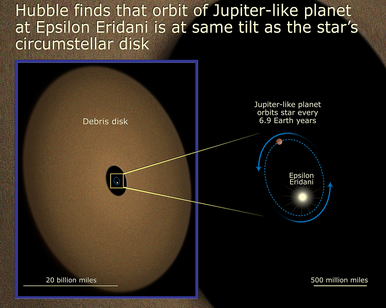 Diagram explaining how the orbit of the Jupiter-like planet at Epsilon Eridani is at the same tilt as the star's circumstellar disc.