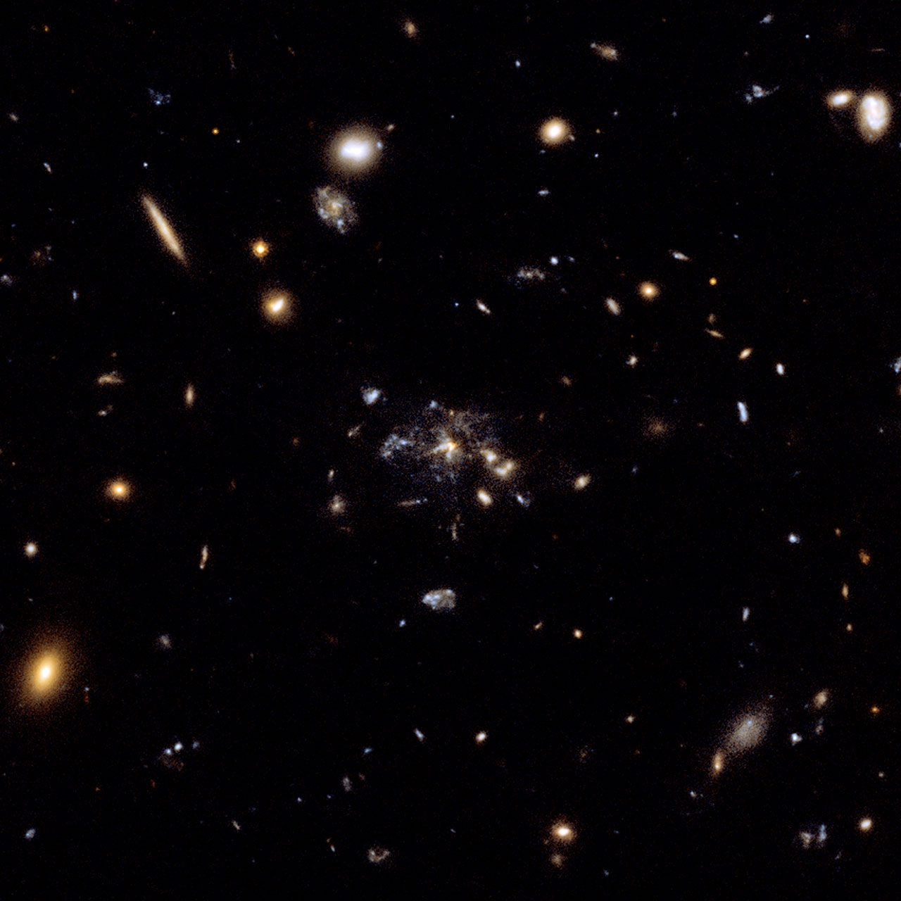 The image provides a dramatic glimpse of a large massive galaxy under assembly as smaller galaxies merge. This has commonly been thought to be the way galaxies grew in the young Universe, but now the Hubble observations of the radio galaxy MRC 1138-262, nicknamed the Spiderweb Galaxy, have shown dozens of star-forming satellite galaxies in the actual process of merging.