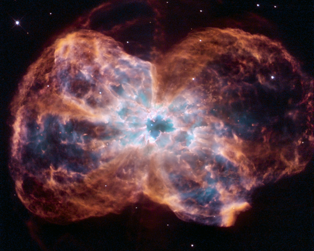 This image of NGC 2440 shows the colourful demise of a star like our Sun. The star is ending its life by casting off its outer layers of gas, which formed a cocoon around the star's remaining core. Ultraviolet light from the dying star makes the material glow. The burned-out star, a white dwarf, is the white dot in the centre.