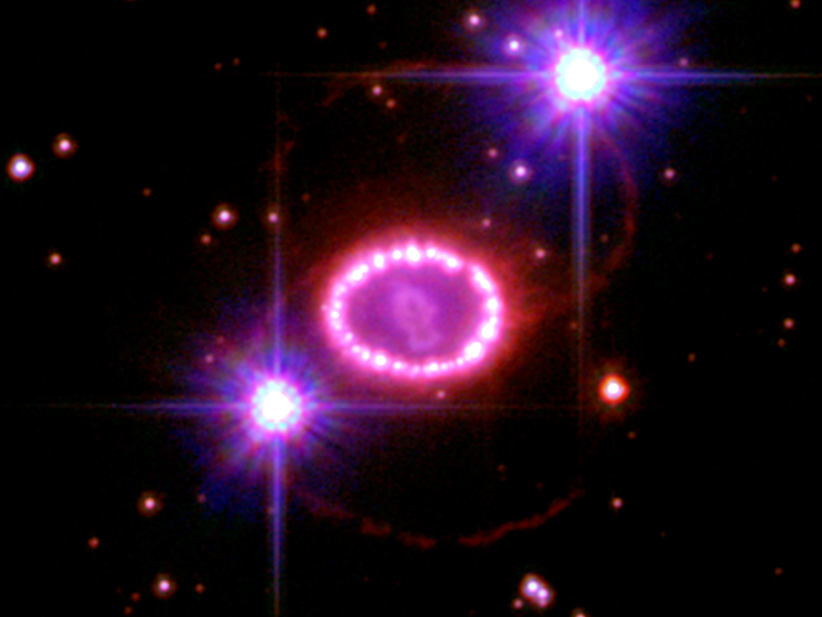 The pink object in the centre of the ring is debris from the supernova blast. The glowing debris is being heated by radioactive elements, principally titanium 44, created in the explosion. The debris will continue to glow for many decades.