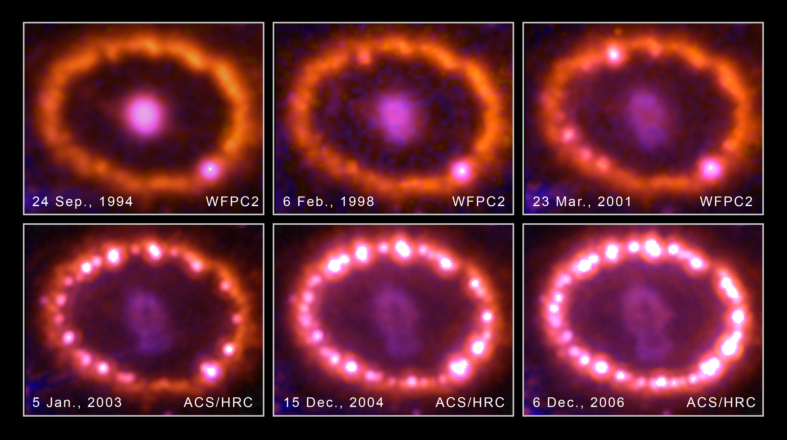 The growing number of bright spots on the ring was produced by an onslaught of material unleashed by the blast. The shock wave of material is slamming into the ring's innermost regions, heating them up, and causing them to glow. The ring, about a light-year across, was probably shed by the star about 20 000 years before the star exploded.